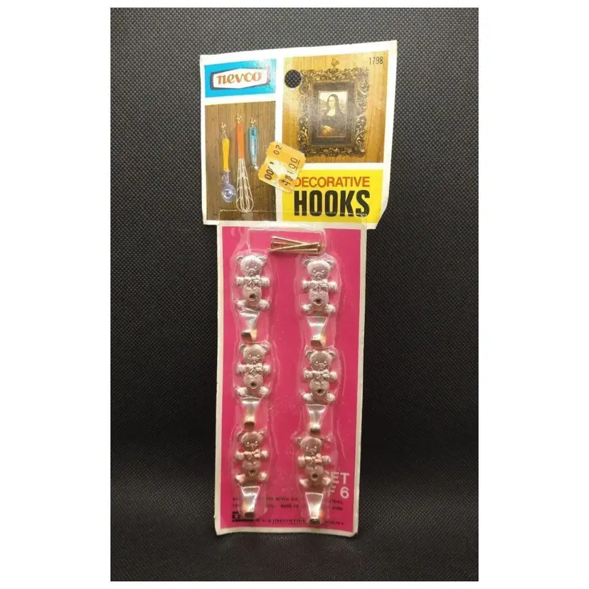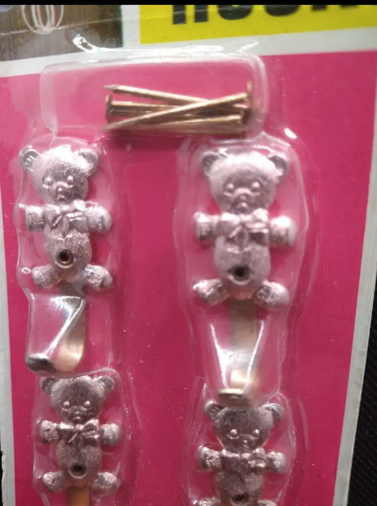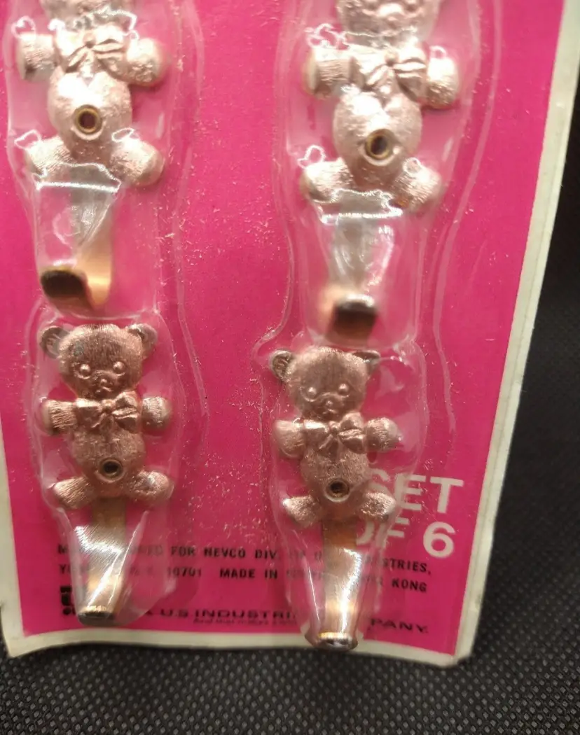 Oh snap! Who wouldn't want a set of cute little pink teddy bear hooks?! Still sealed in original packaging. From Nevco. Includes 6 pink teddy bear hooks and nails.