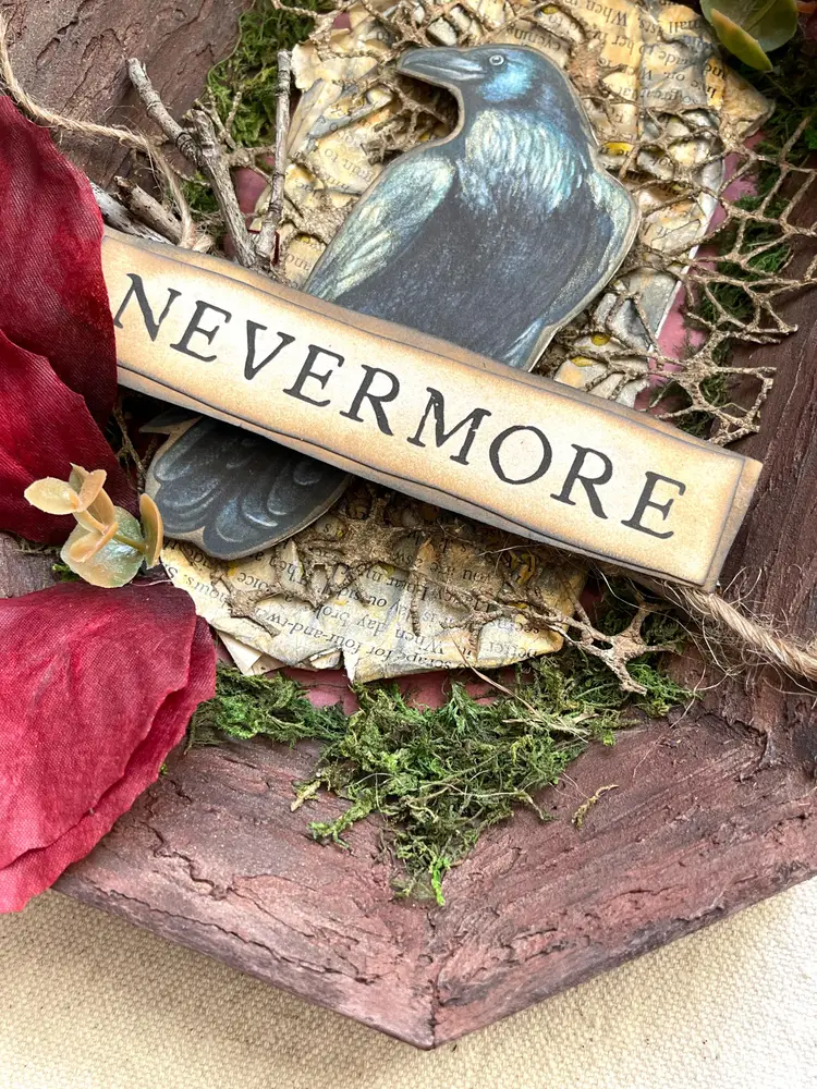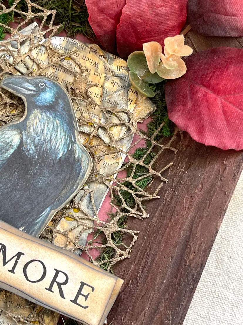 Crafted on a wooden base with texture paste for a tree bark inspired look, this piece also includes acrylic paint, mica stain, distress ink, twine, and ribbon (behind the raven) for an enjoyable visual experience.