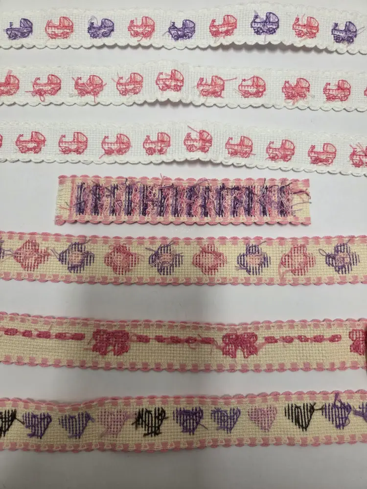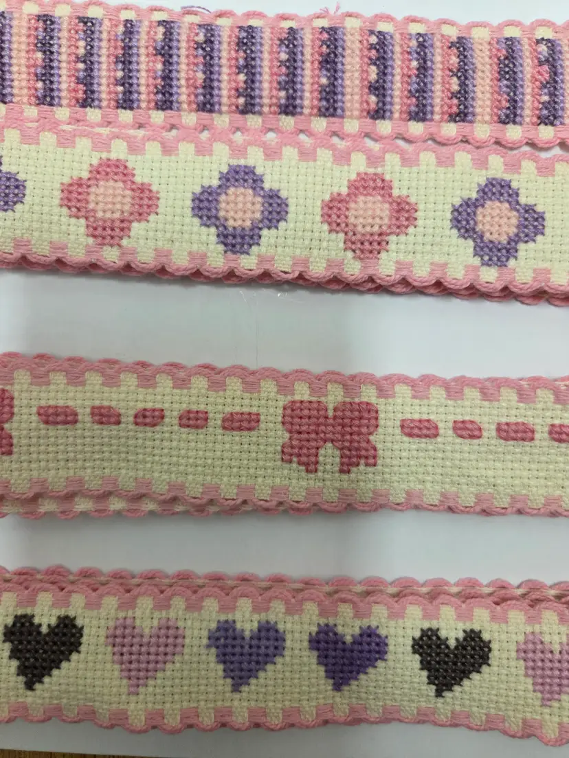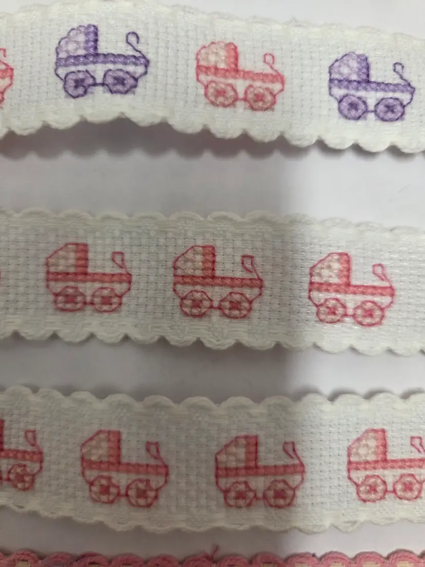 Lot of 7 pieces of Ribband cross-stitched by seller. Length of pieces vary 3 baby carriages pieces 10 1/2", stripes 5 1/2", flowers 28 1/2", bows 35 1/2" and hearts 35 1/2". Ribband is 1" wide. Great for adding to craft and sewing projects.