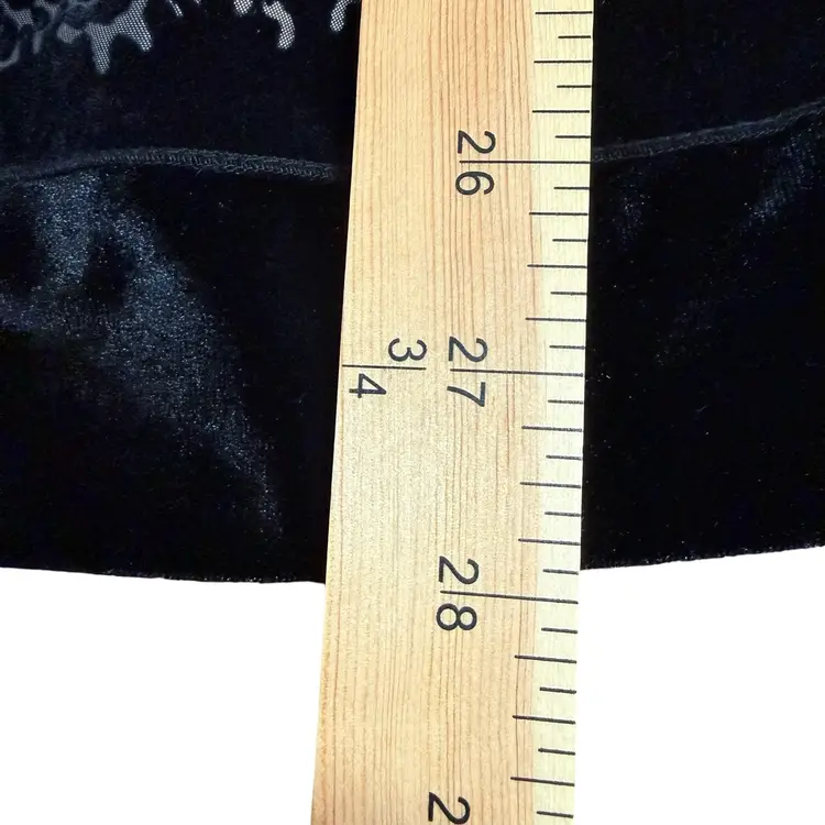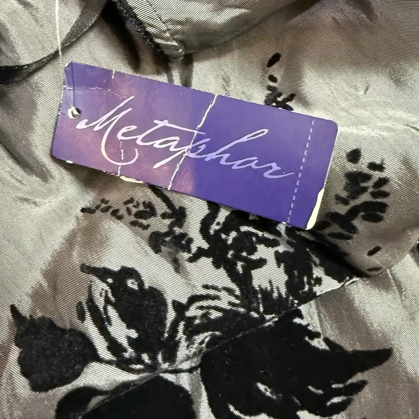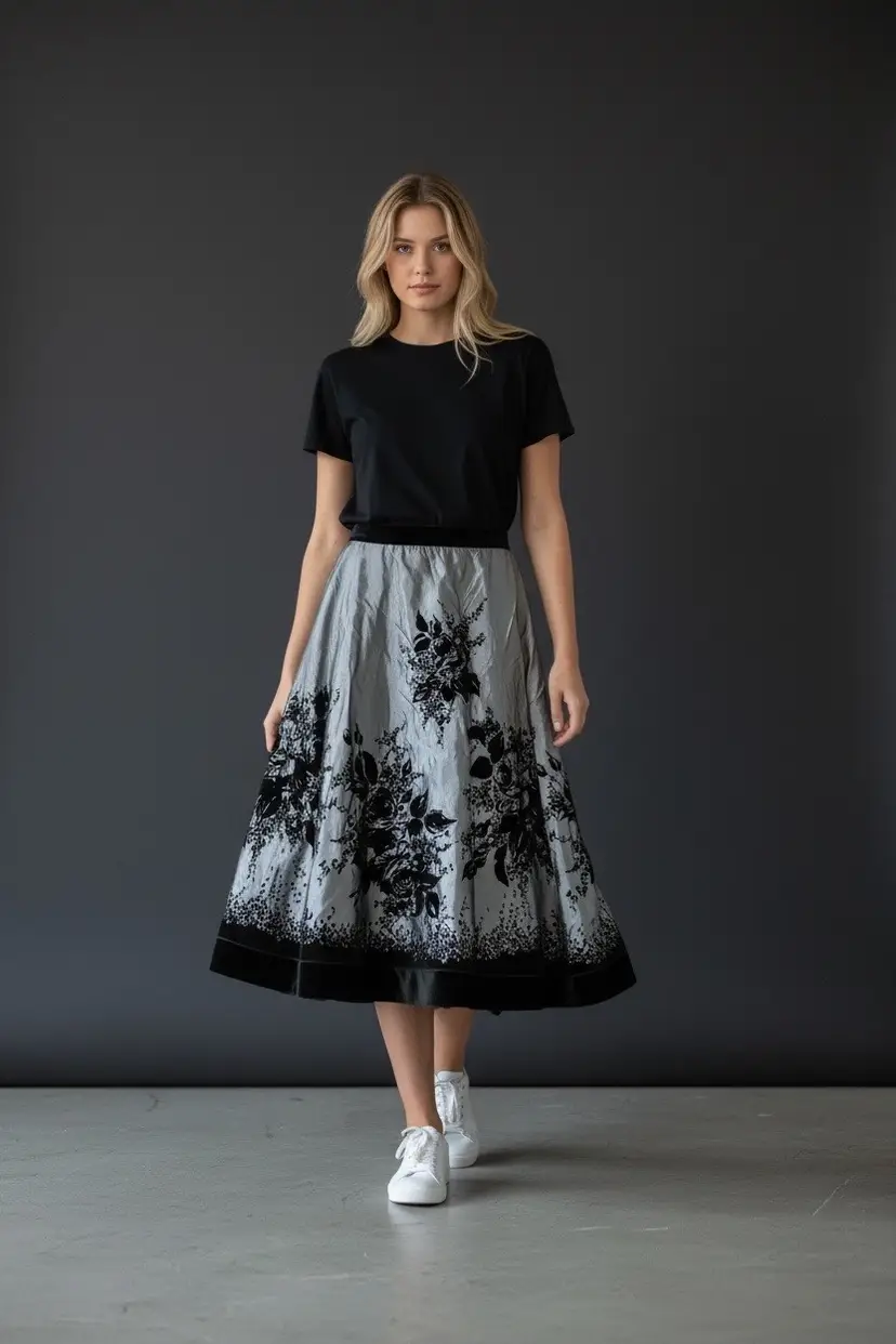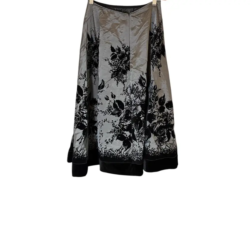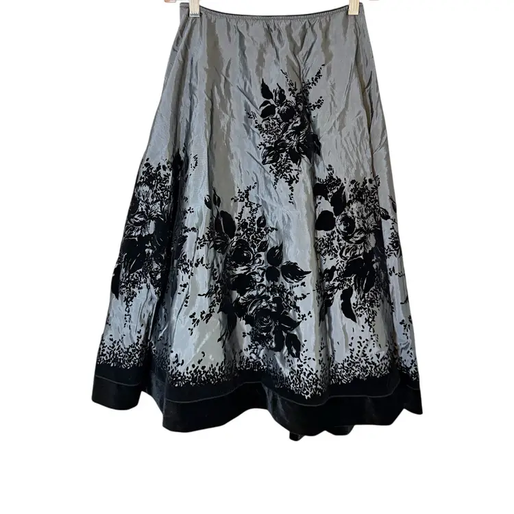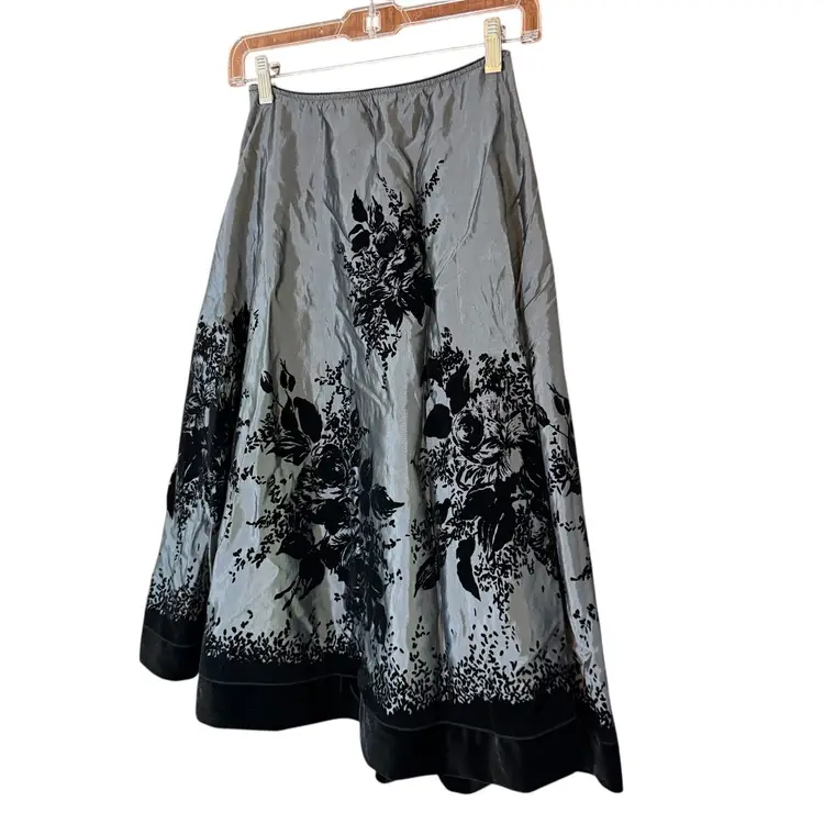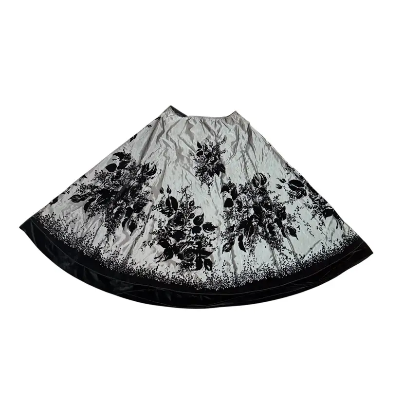 This A line circle skirt in gray and black with flocked velvet roses is perfect for those who embrace whimsigoth and dark romantic styles. The taffeta fabric with a floral pattern and flocked accents adds a touch of elegance, making it suitable for various occasions from casual to formal. The skirt features a zipper closure for a flattering fit. Whether for a party, cocktail event, or simply to add a touch of romance to your everyday look, this skirt from Metaphor is a versatile and stylish addition to any wardrobe.