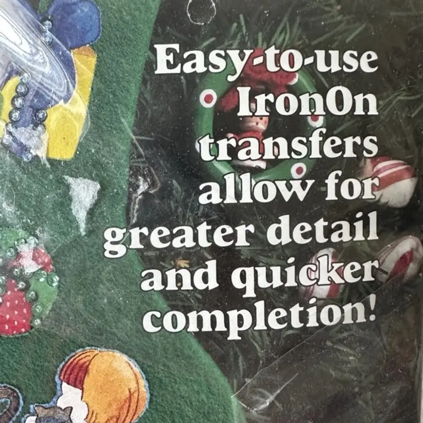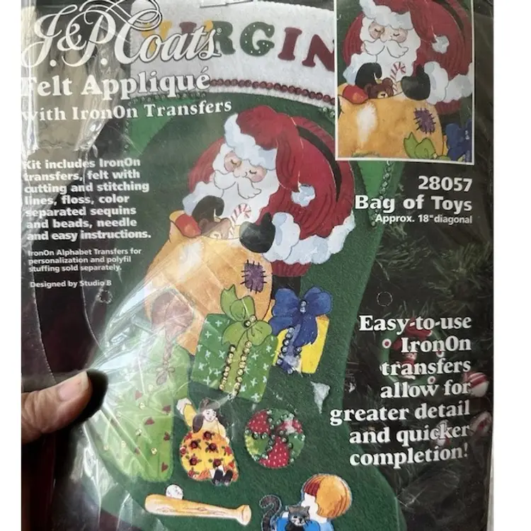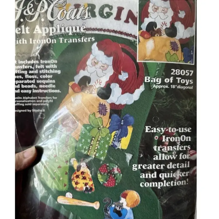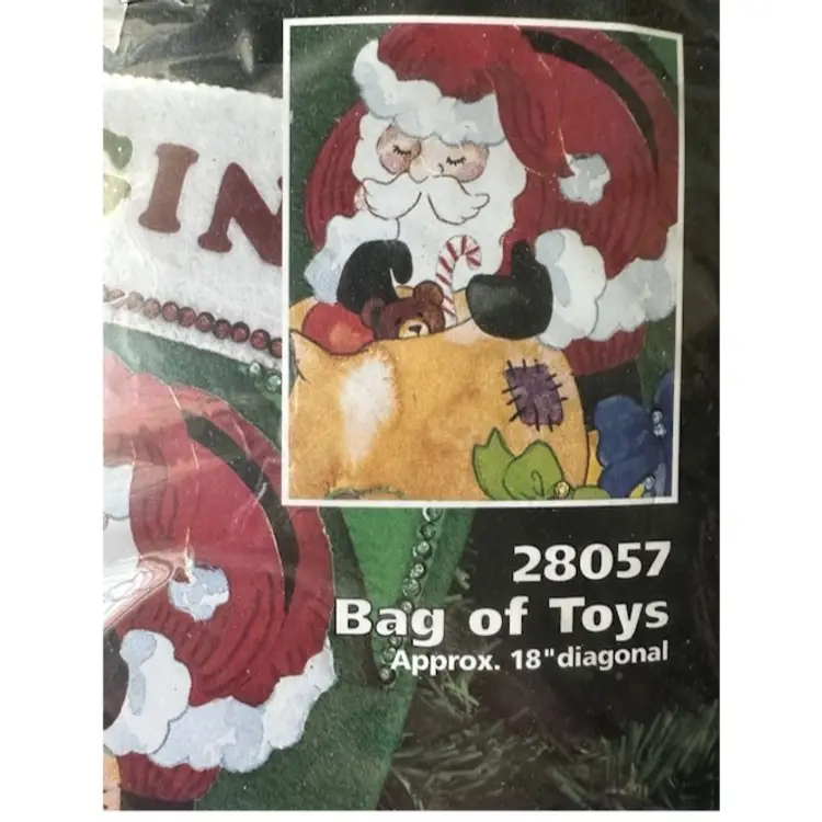 This is a new Christmas Stocking Kit by J&P Coats & Clark, featuring a design of Santa's Bag of Toys on felt. The model number for this kit is 28057, and it is made in the United States. The kit includes all the materials needed to create a festive Christmas stocking, making it a perfect project for the holiday season. This stocking kit would be a great choice for crafters interested in embroidery and looking to add a handmade touch to their holiday decorations.