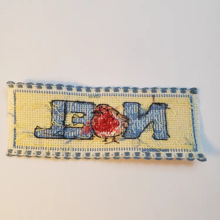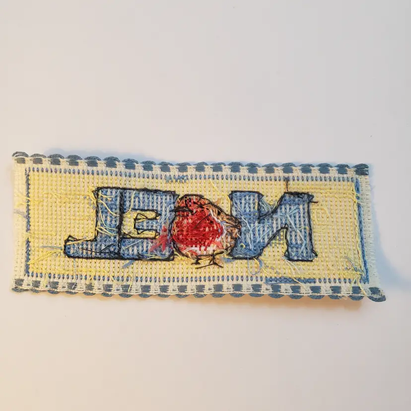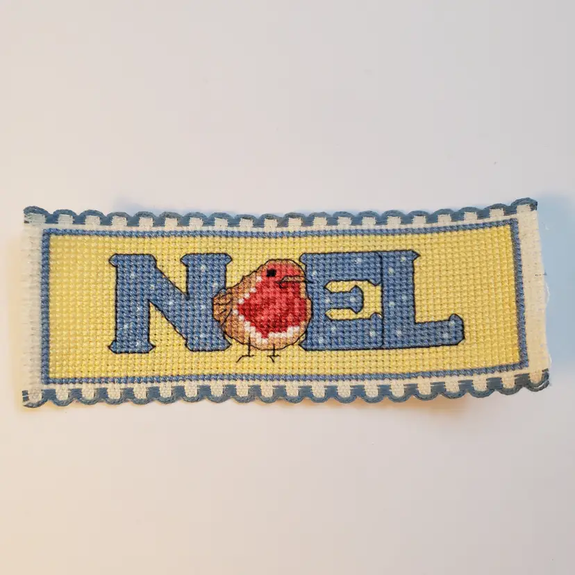 Cross-stitched "Noel" bookmark stitched on Ribband with blue trim 2"× 5 1/4".