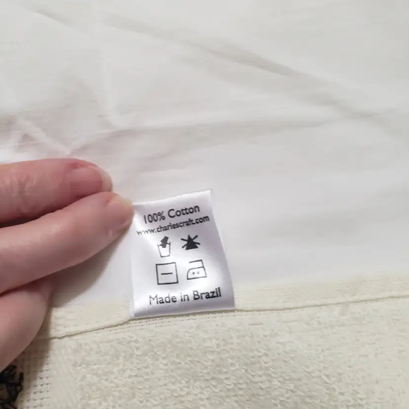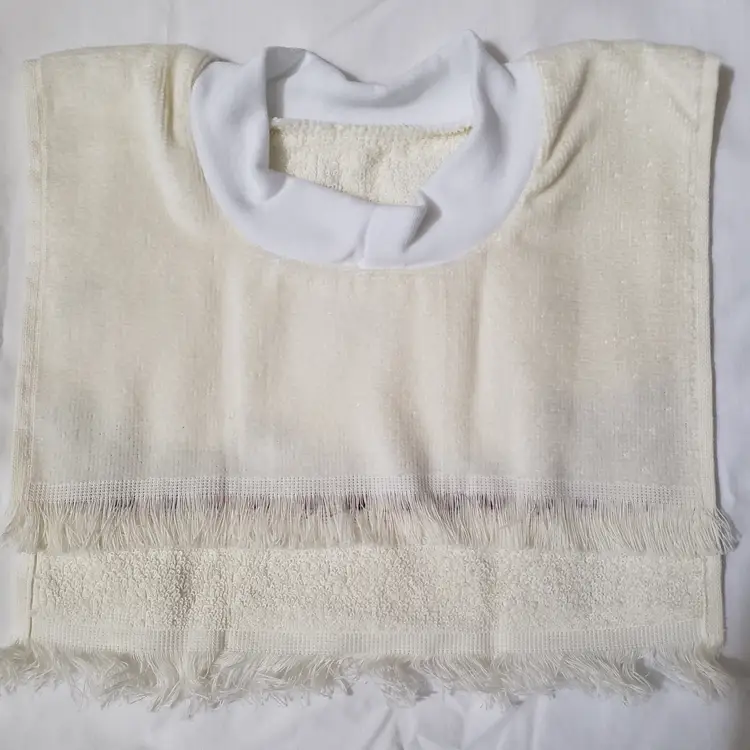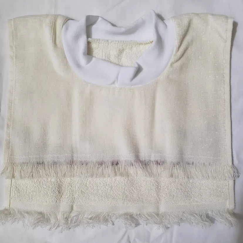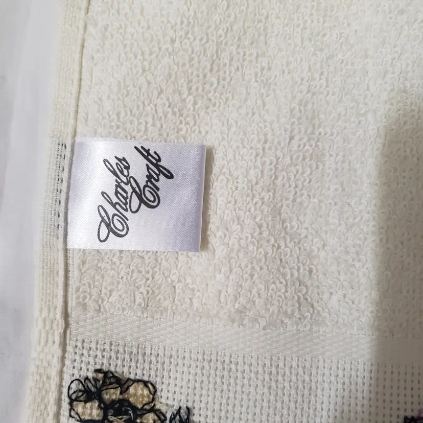 New cross-stitched flower and insect design on Charles Craft ivory velour pullover toddler bib. Bib is made out of 100% cotton and measures 12" x 19.5".