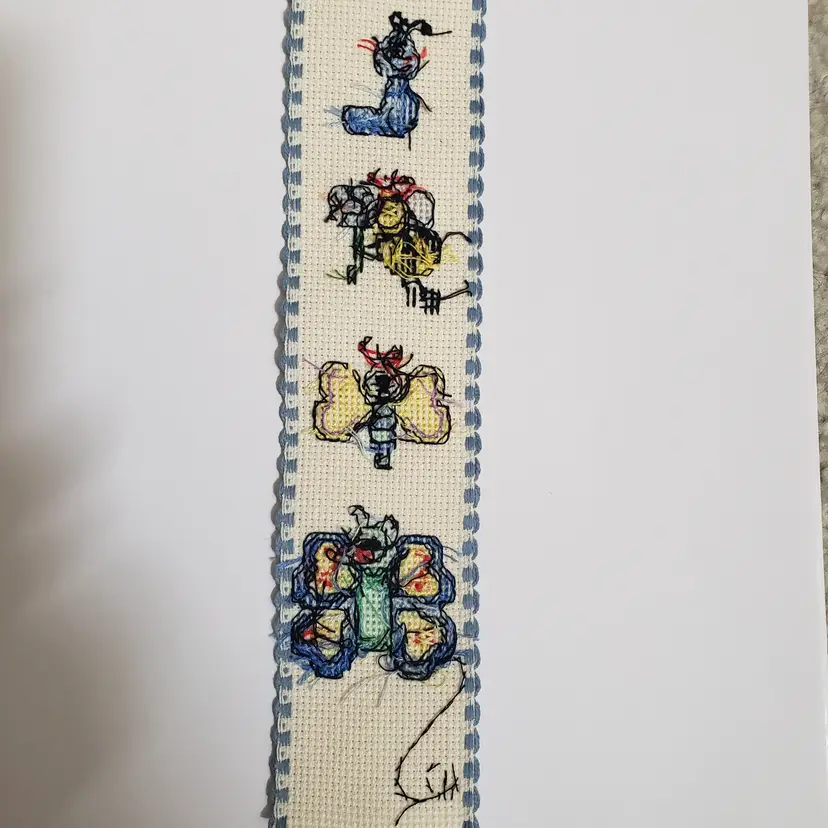 New cross-stitched bookmark 2"× 8 3/4". Book mark is stitched on ivory Ribband with blue trim.