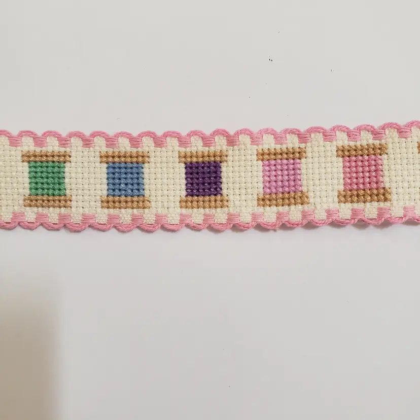 Cross-stitched ivory with pink trimmed Ribband multi colored spools of thread themed. Great for adding to your craft project. 1"×36"
