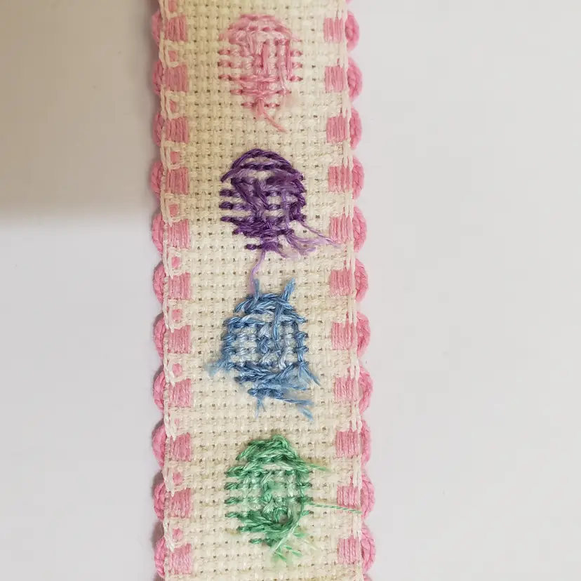 Cross-stitched Ribband ivory with pink trim multi colored button themed. Great for adding to your craft projects. 1"× 28"