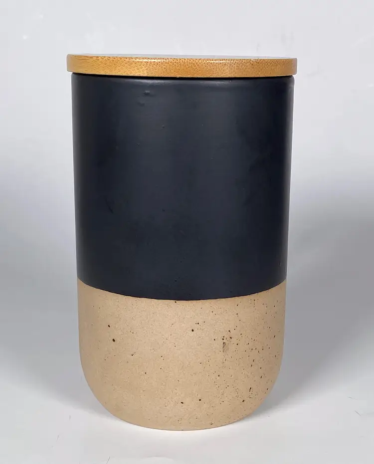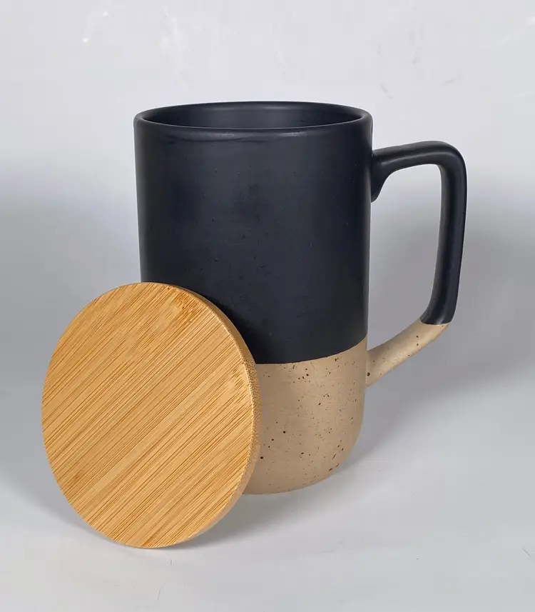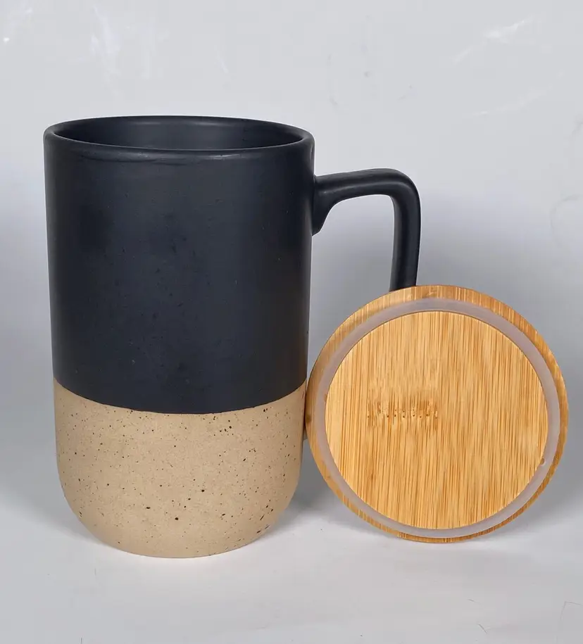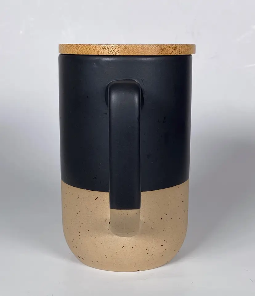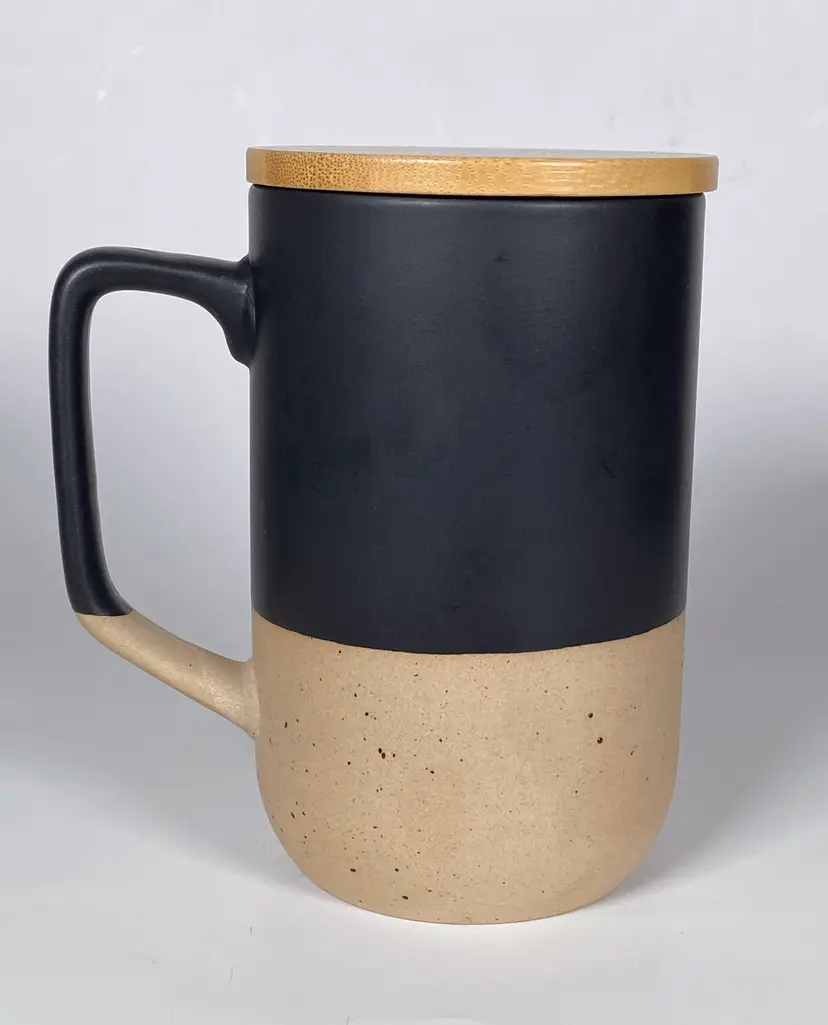 Keep your beverages piping hot with this ceramic mug by DesignPac Gifts, with it's spill resistant push-on wood lid. This microwave-safe mug sports an attractive black & cream two-tone design with a matte glazed finish on upper body and inner wall, speckled clay on its base. 16 ounce capacity. This is an out-of-box item. New-unused.