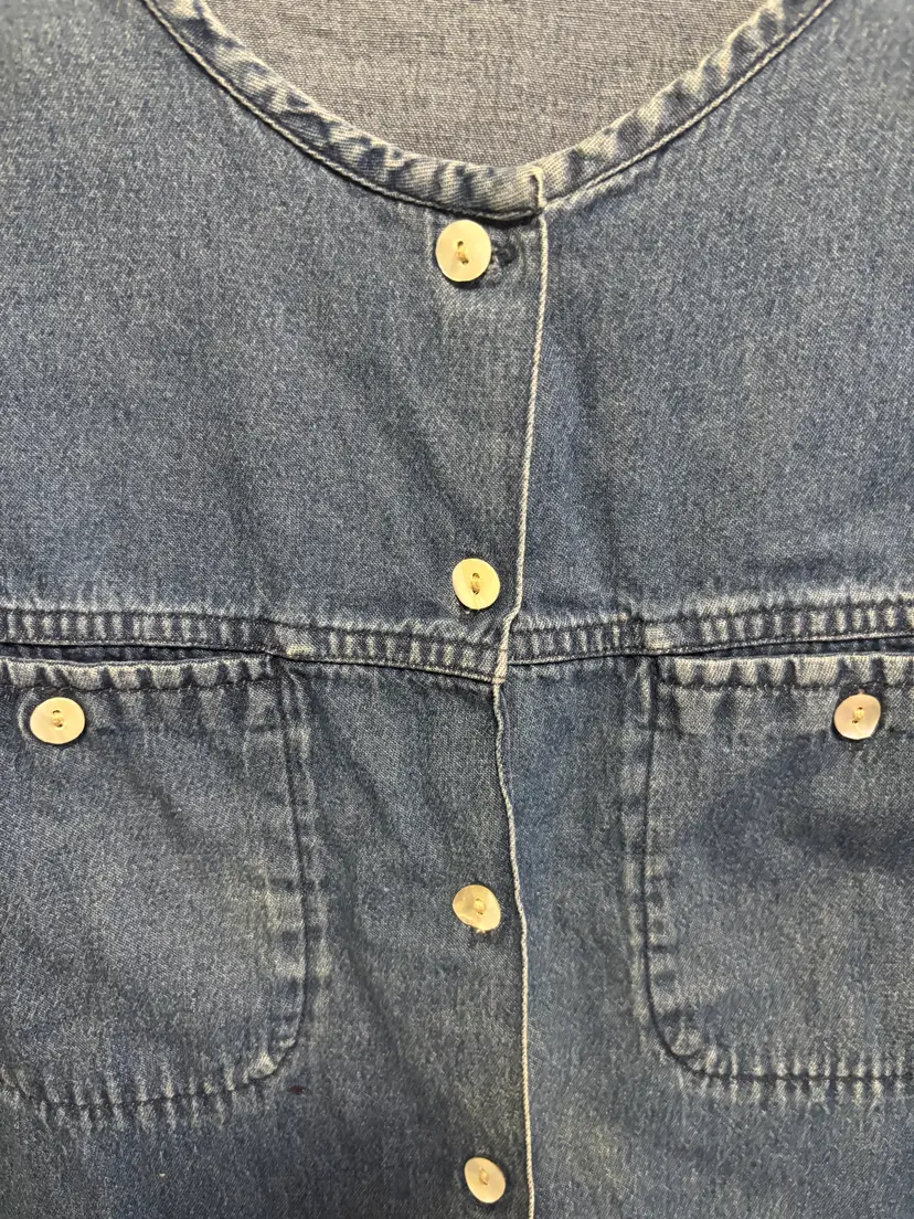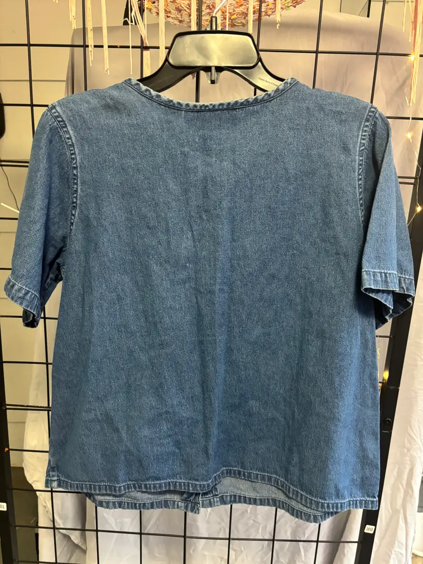 Cute double pocket front ladies light weight denim shirt with mother of pearl button up front. Does not have a size tag, but measures like a lg. pit to pit 21" & 22.5" L