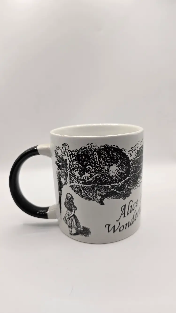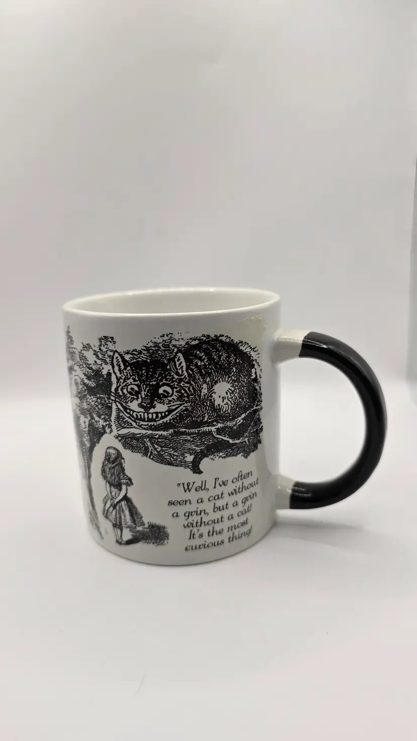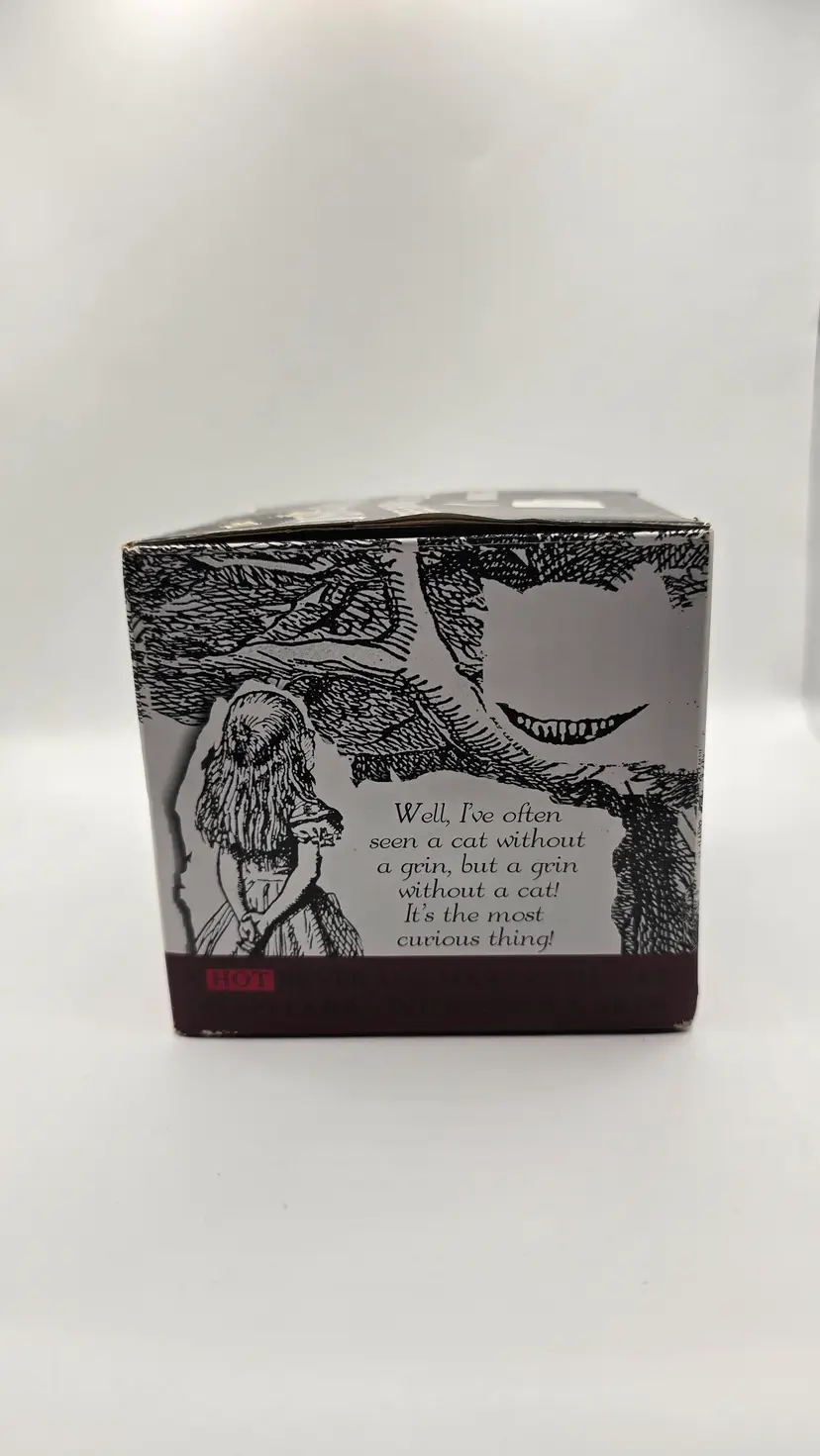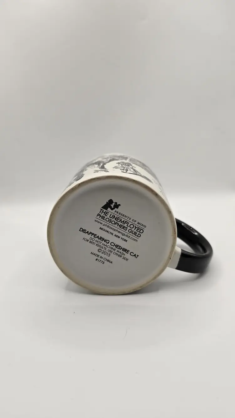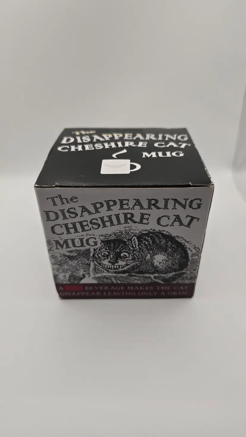 Brand-new, never used, in the original box. This heat-changing Disappearing Cheshire Cat Mug by The Unemployed Philosophers Guild features classic Alice in Wonderland artwork. When a hot beverage is added, the Cheshire Cat fades away, leaving only its famous grin.