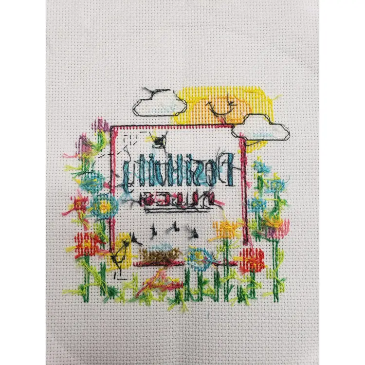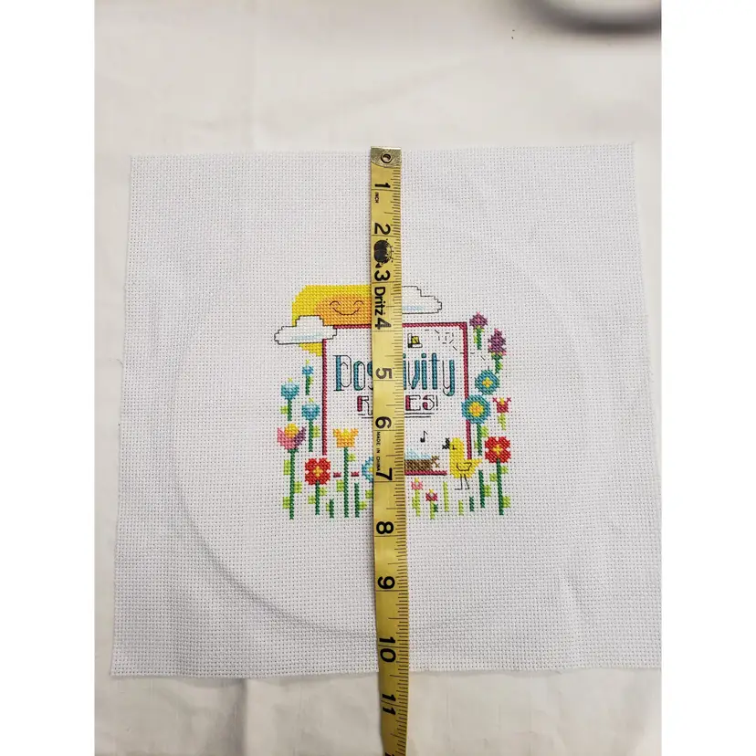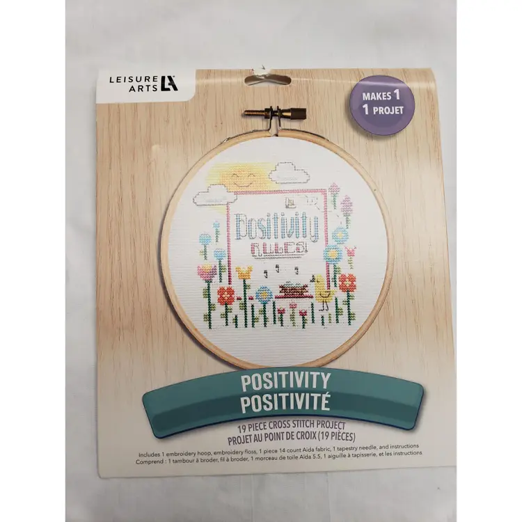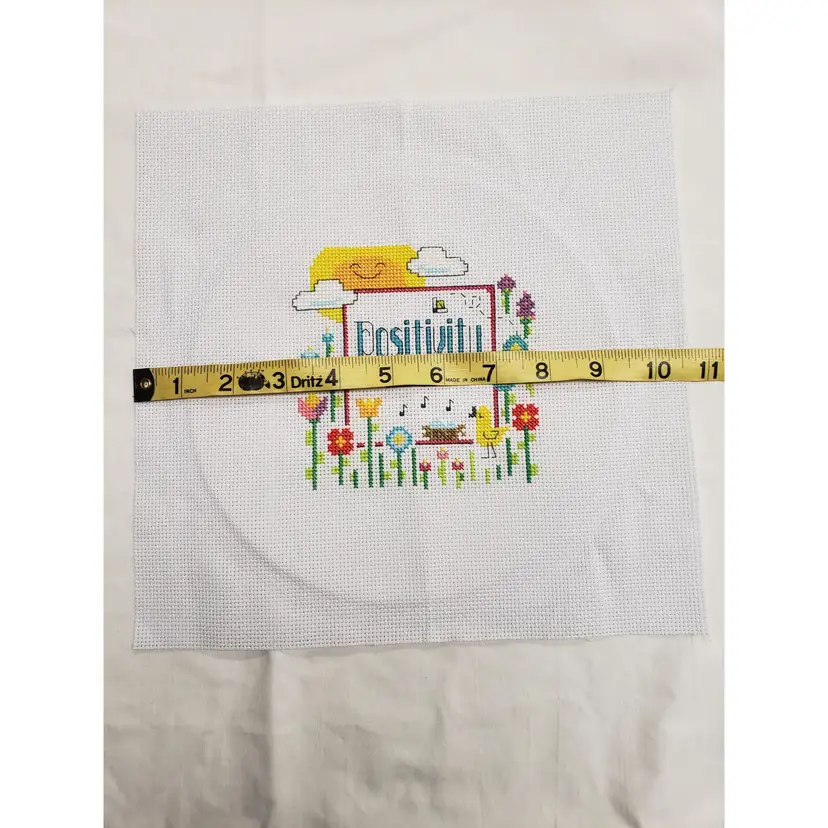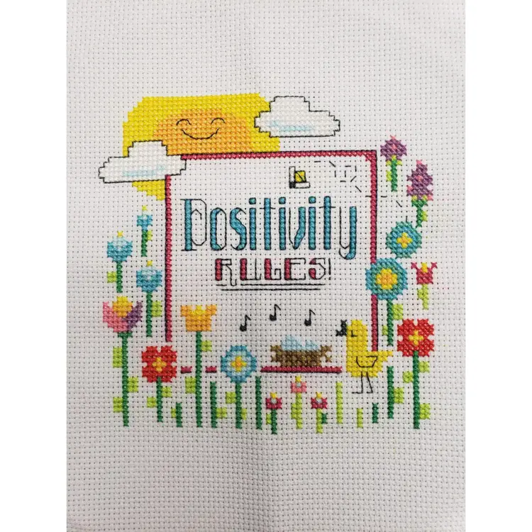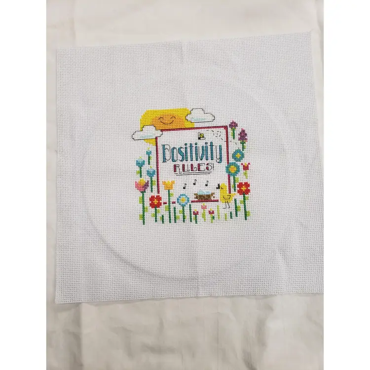 Seller stitched "positivity rules" cross-stitch piece from Leisure Arts kit # 56849 Positivity. Please see photos for measurements. Seller will include embroidery hoop so that seller can display in hoop or frame piece.