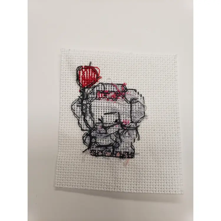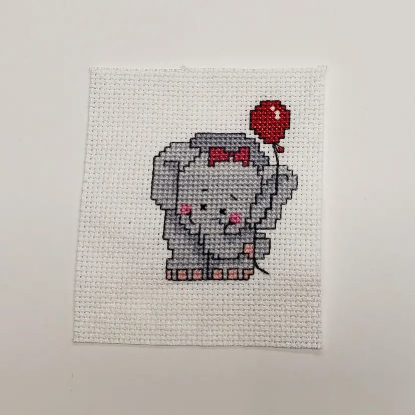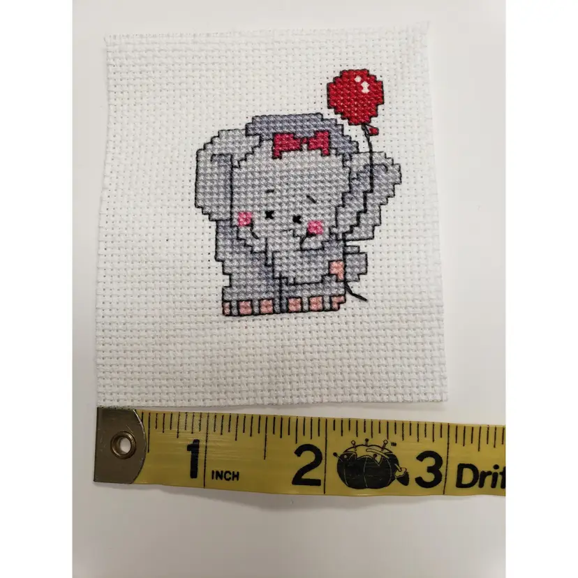 Seller stitched baby girl elephant with read balloon cross-stitch piece. Please see photos for measurements.