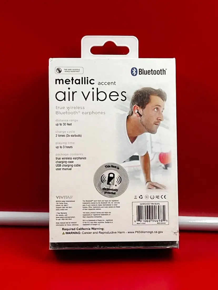 Create a superior listening experience without the hassle of tangling wires with a pair of Vivitar Air Vibes True Wireless Bluetooth Earphones!With true wireless, automatic pairing, and the ability to answer calls,these earbuds give you the perfect hands free experience-especially when used with a smart phone. You can listen to audio for upto 3 hours on one charge and they have a pairing range of up to 30 feet.It also features Bluetooth lights, rechargeable batteries, musiccontrol, and even a protective case!