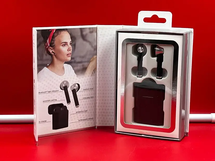 True Wireless Headphones Bluetooth Range - 30 Feet Call/Play Time - 3 Hours Rechargeable- Case Charges 2 Times Bluetooth Light Indicator Automatic Pairing Controls Music Includes- Protective Charging Case, True Wireless Earphones, USB Charging Cable, User Manual. Please note this item was a store display unit.