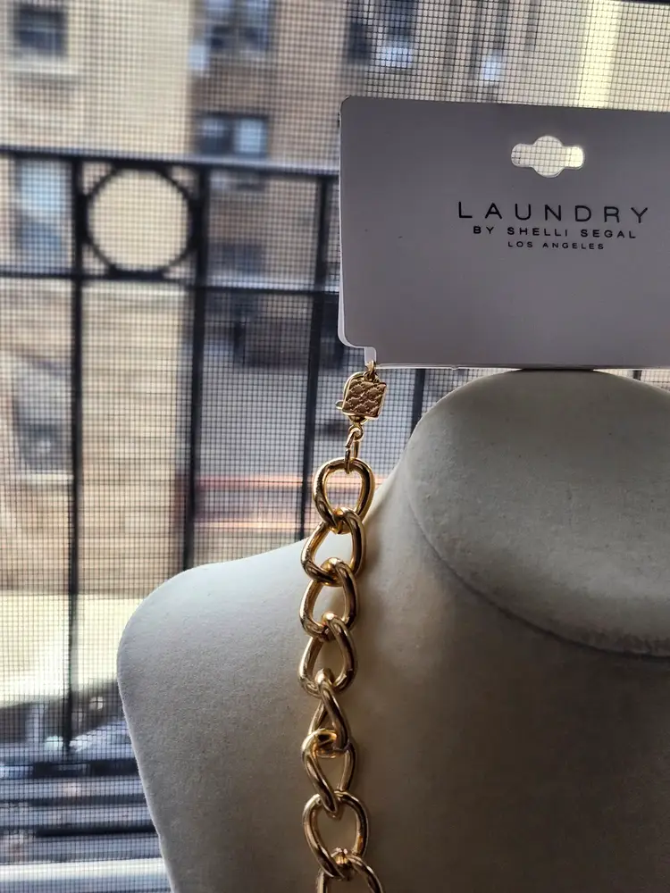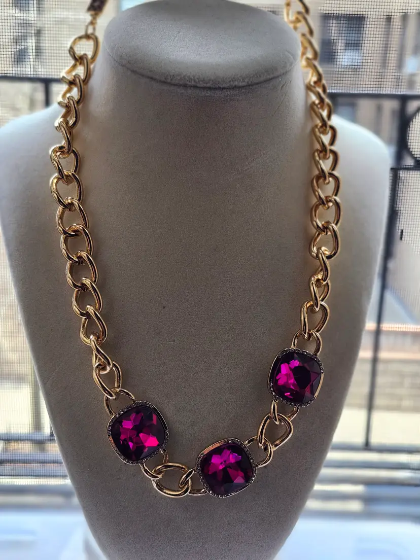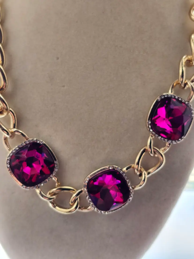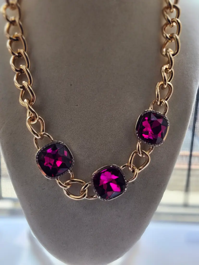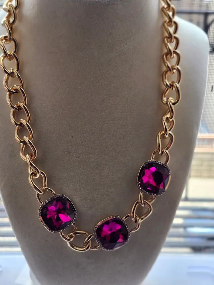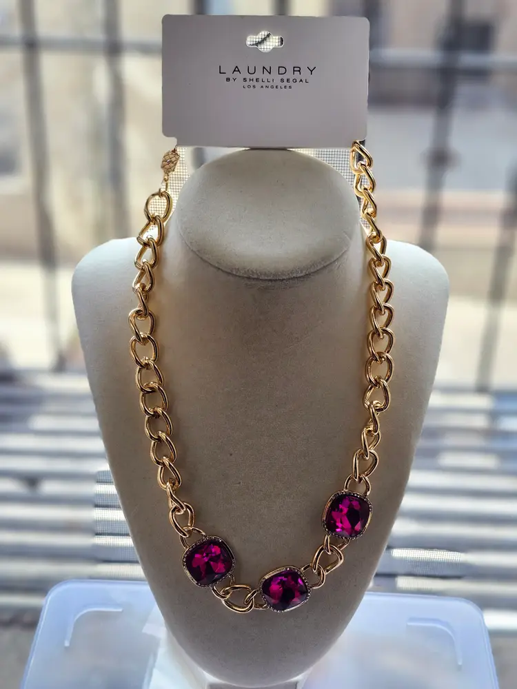 Elevate your jewelry collection with this stunning gold tone link necklace from Laundry by Shelli Segal. Adorned with fuchsia rhinestones and emerald shaped crystals, this piece is perfect for adding a touch of glamour to any outfit. The square pendant shape and chain style make this necklace versatile and suitable for any occasion, Crafted from high-quality crystal, glass, and base metal, this necklace is a must-have for any beauty-themed jewelry collection. Brand New