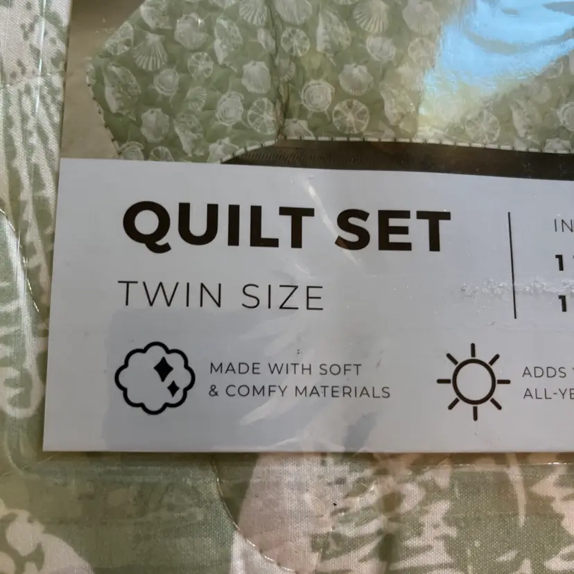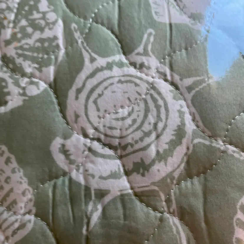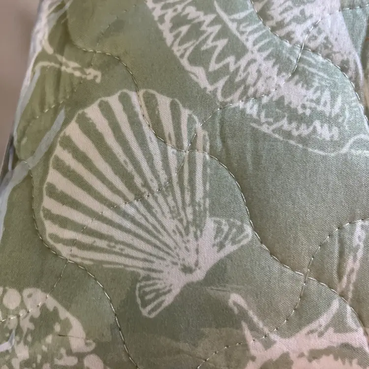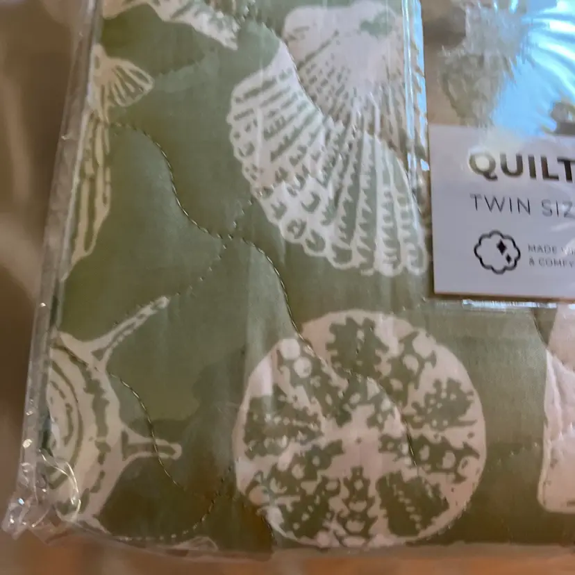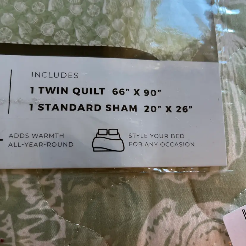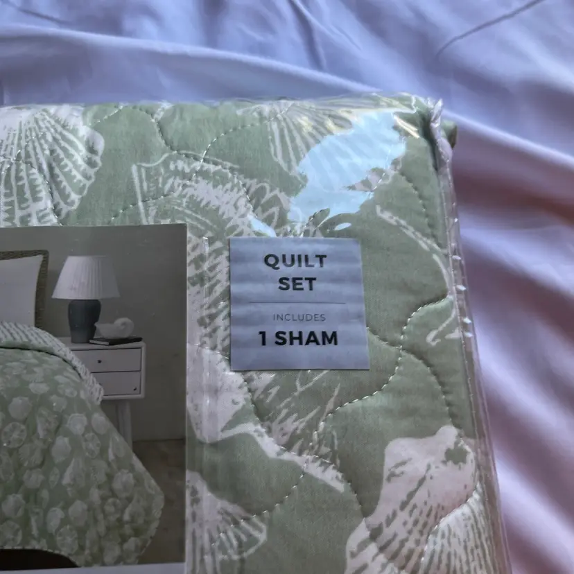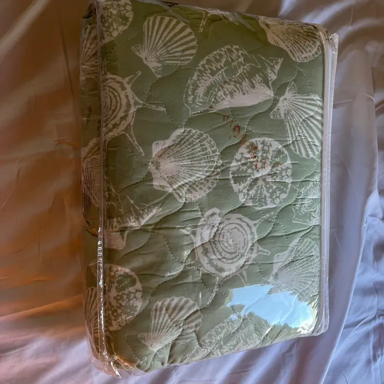 The NEW Laura Ashley TWIN Size Linley Quilt & Sham Set in green sea shell design is a stylish addition to any bedroom. Made with a soft cotton blend fill, this quilt set is perfect for all seasons and features a charming French Country style. The rectangular shape and seashell pattern add a touch of nature to the room, while the machine wash care instructions make it easy to keep clean and fresh. Ideal for teens and adults alike, this quilt set is a cozy and beautiful choice for any bedroom setting.