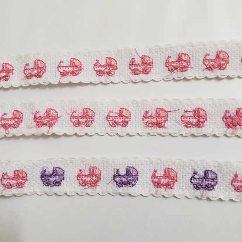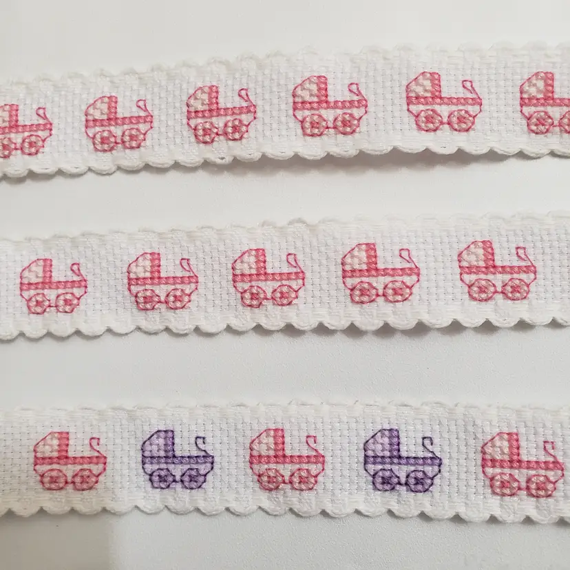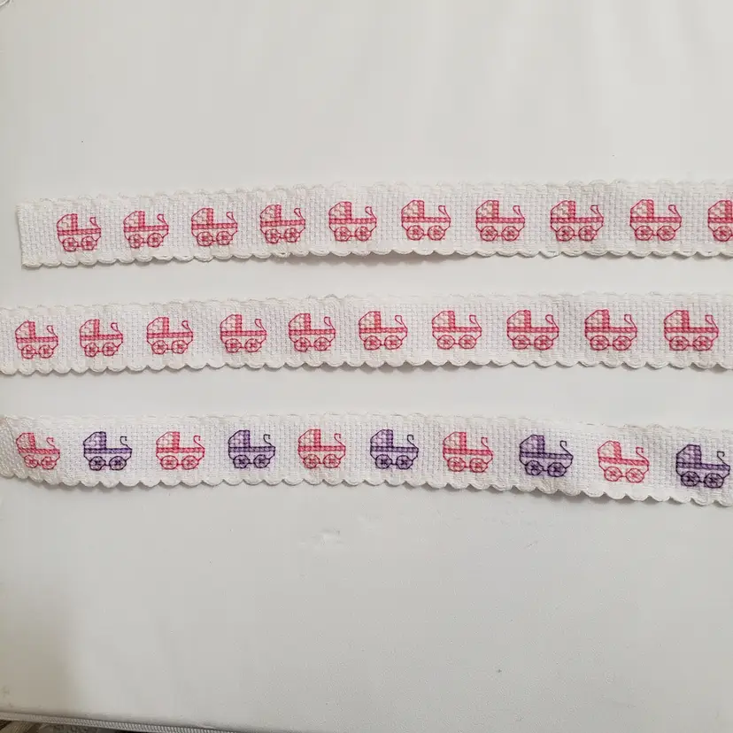 Three pieces of white Ribband with pink and purple baby carriages cross-stitched on them. Can be added to your craft and sewing projects. One piece is 1"×10 1/2" (pink carriages), one piece 1"x 11 1/4 " (pink carriages) and one 1"× 11" pink and purple carriages).