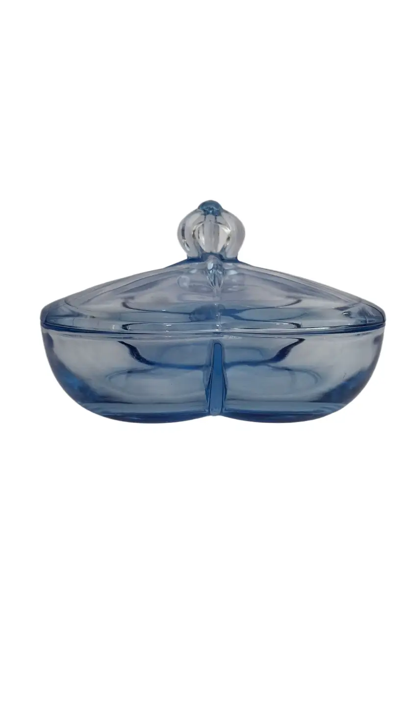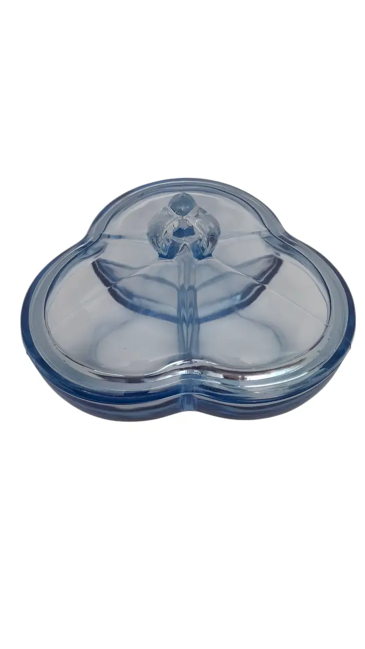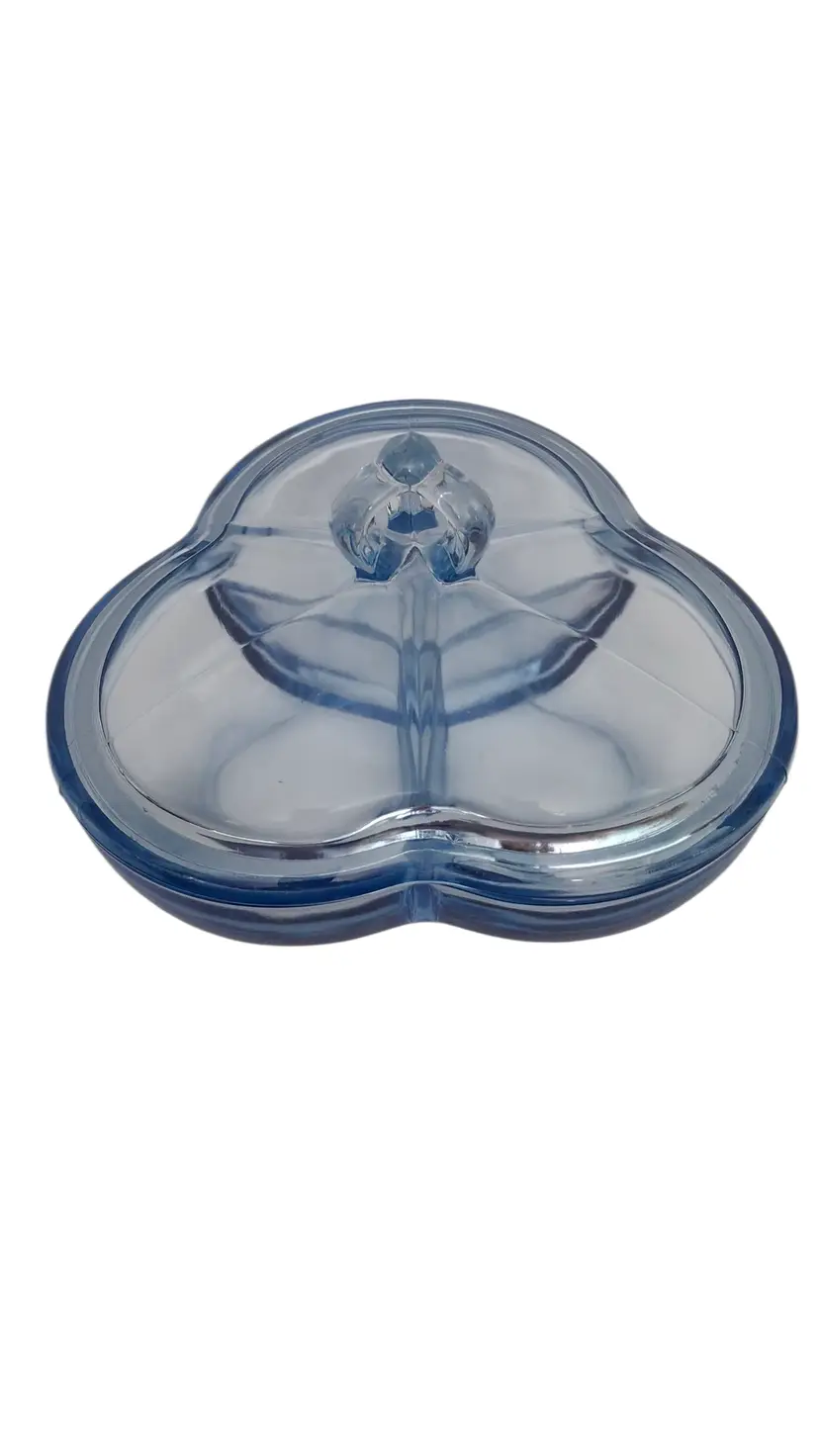New Martinsville Glass Blue Clover Covered Candy Dish • 3 Part Divided Mid Century Modern Glass Lidded Server • Blue Relish Dish This lovely Mid Century Modern New Martinsville Glass covered candy dish features the iconic Clover three-lobed shape in the light “ice” blue color. The soft, luminous blue catches the light beautifully, making it a charming accent piece for vintage, cottage, or Scandinavian-style décor. The dish includes its original fitted lid with rounded sculpted crown finial, and the interior is divided into three compartments, perfect for candy, nuts, condiments, cotton rounds, jewelry, or vanity display. Dimensions: approximately 7.5" wide and 5" tall including the lid. There is one small chip on the underside of the lid, shown in photos — it is not visible when displayed. ✅ Identification • Maker: New Martinsville Glass • Pattern/Form: “Clover” / Three-Lobe Covered Candy or Relish Dish • Color: Ice Blue • Era: ca. 1955–1970 • Condition: One small chip on underside of lid (not visible when displayed)