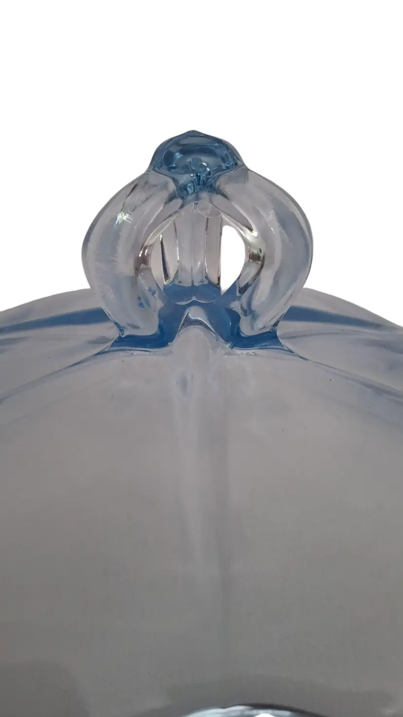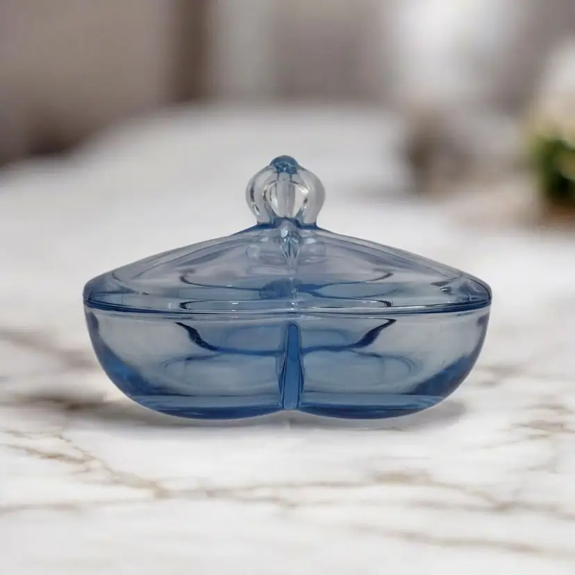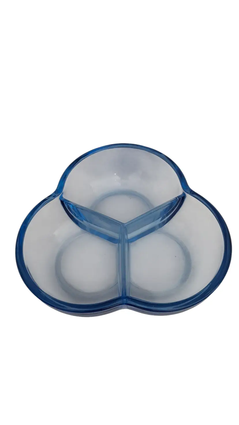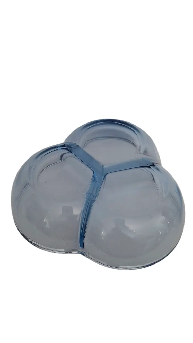 New Martinsville Glass Blue Clover Covered Candy Dish • 3 Part Divided Mid Century Modern Glass Lidded Server • Blue Relish Dish This lovely Mid Century Modern New Martinsville Glass covered candy dish features the iconic Clover three-lobed shape in the light “ice” blue color. The soft, luminous blue catches the light beautifully, making it a charming accent piece for vintage, cottage, or Scandinavian-style décor. The dish includes its original fitted lid with rounded sculpted crown finial, and the interior is divided into three compartments, perfect for candy, nuts, condiments, cotton rounds, jewelry, or vanity display. Dimensions: approximately 7.5" wide and 5" tall including the lid. There is one small chip on the underside of the lid, shown in photos — it is not visible when displayed. ✅ Identification • Maker: New Martinsville Glass • Pattern/Form: “Clover” / Three-Lobe Covered Candy or Relish Dish • Color: Ice Blue • Era: ca. 1955–1970 • Condition: One small chip on underside of lid (not visible when displayed)