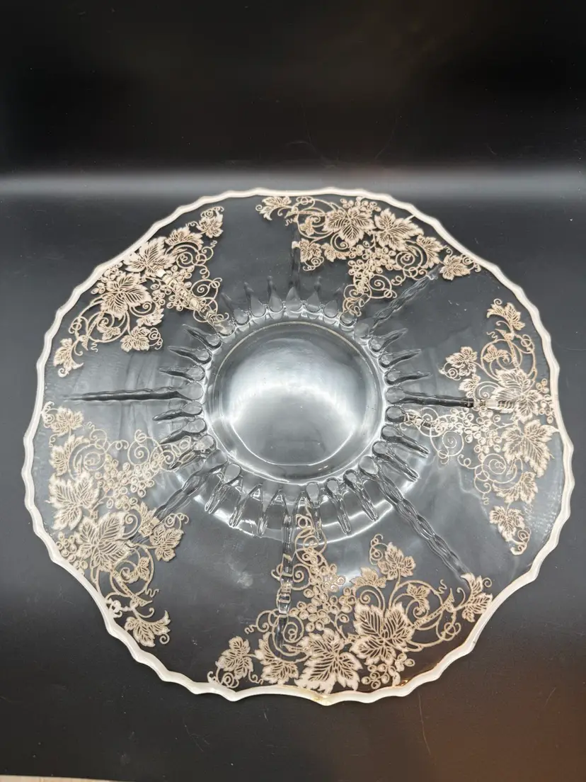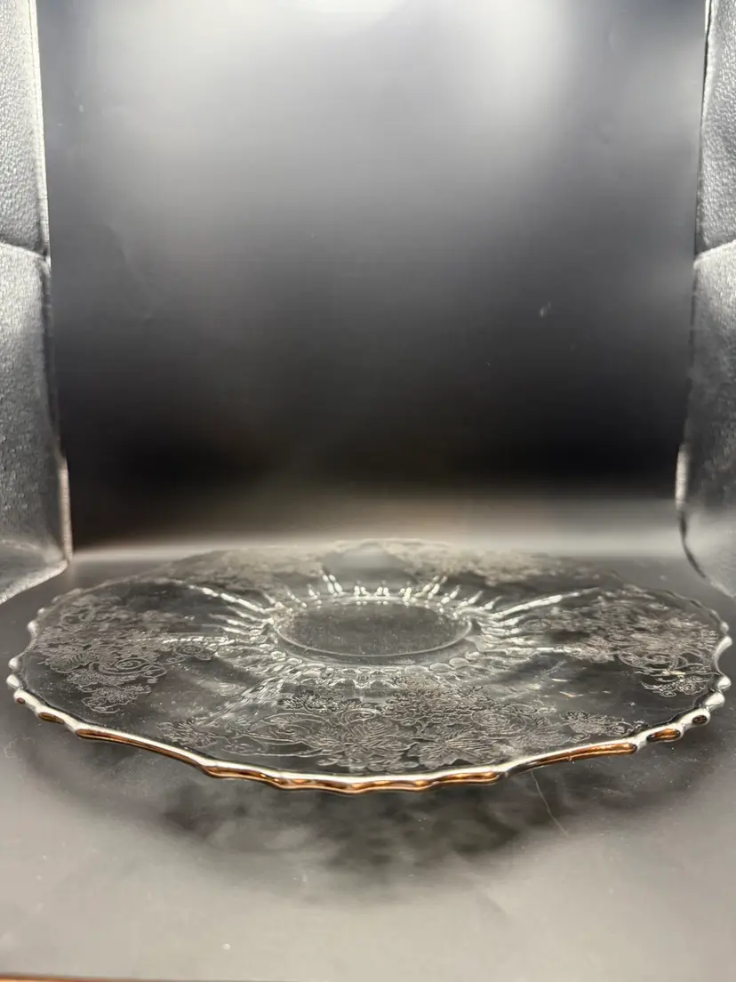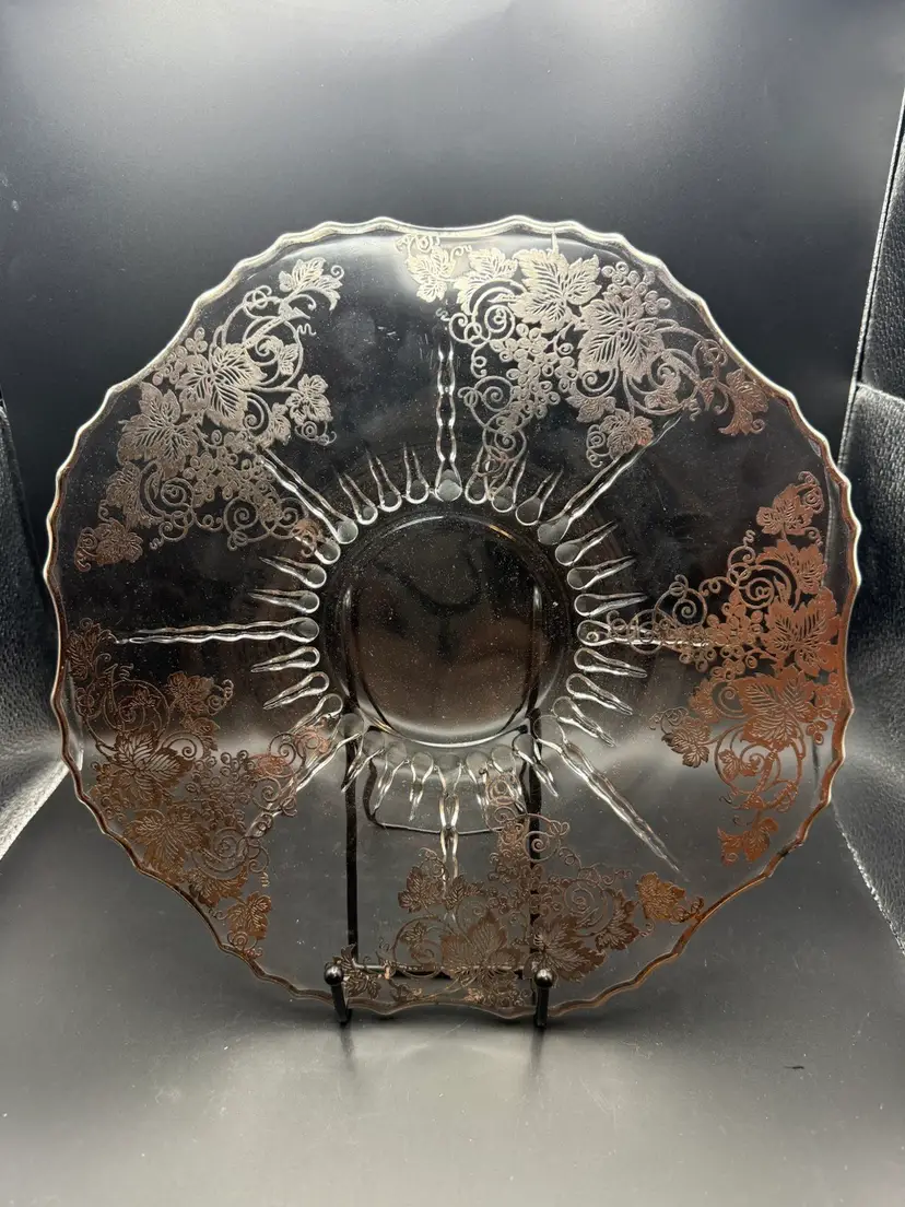 This is a vintage glass plate with sterling silver overlay. It features a distinctive floral and vine etching, possibly in the "Floral Wreath" pattern by New Martinsville. The plate has a scalloped, ruffled edge and sits on three small feet. The silver overlay provides an elegant, antique appearance. Similar items date back to the early 1900s, before New Martinsville was sold to Viking Glass in 1936.