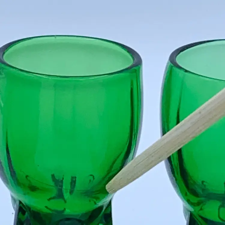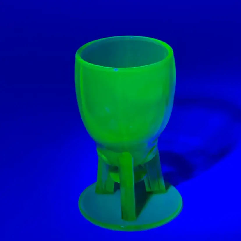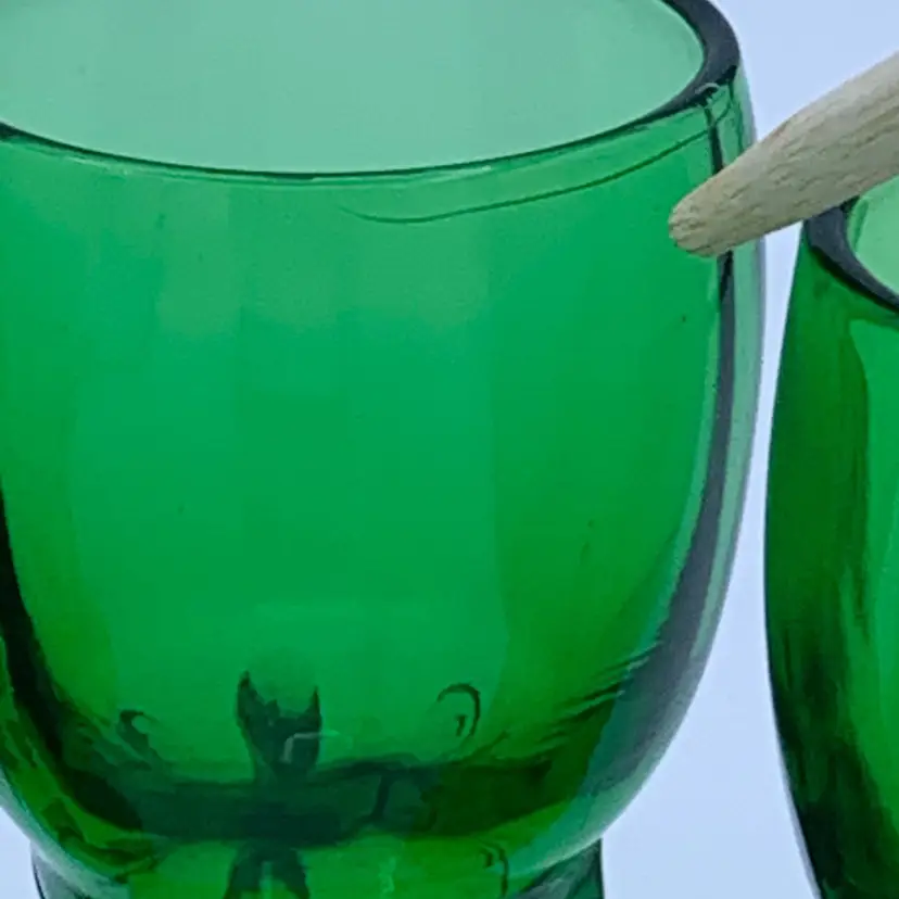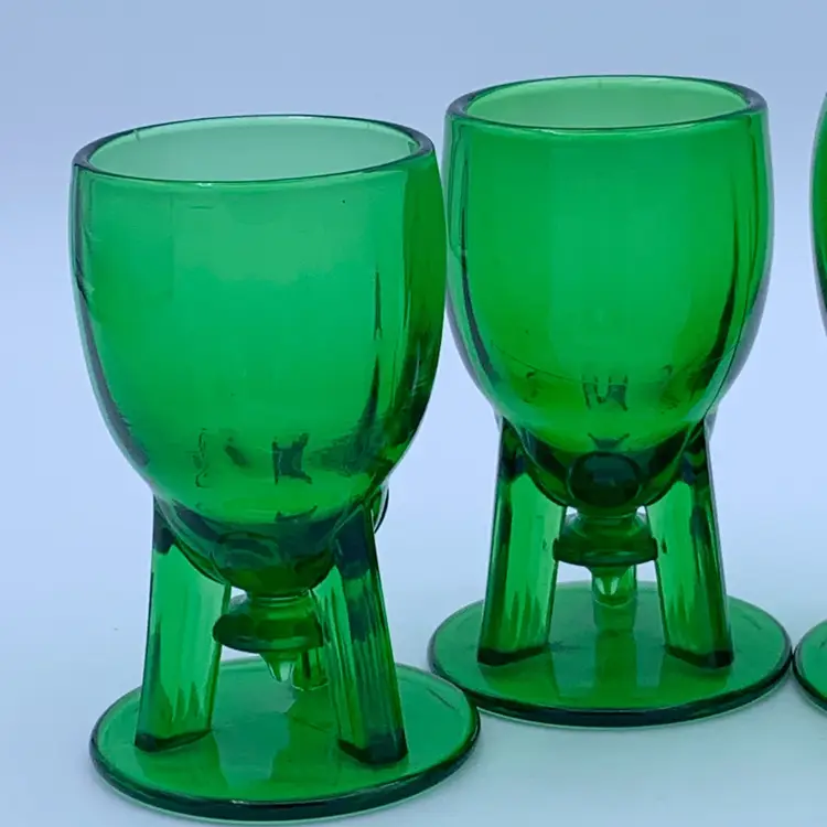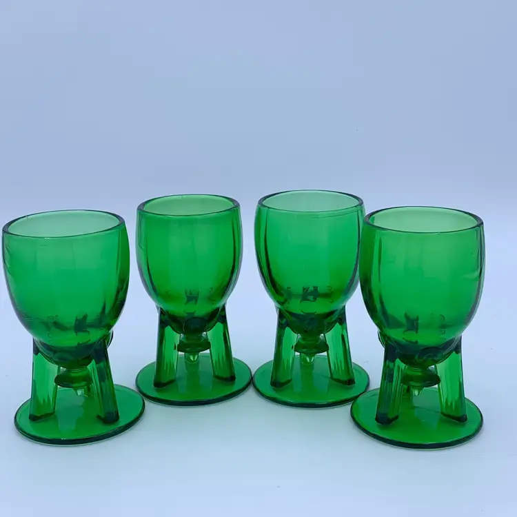 This set of four cordial glasses from New Martinsville (later became Viking) are a stunning addition to any collection. The vintage glasses feature an art deco design with a green color - referred to as Evergreen by the company - and the Moondrop product line. These glasses are made with uranium glass and they glow! Hand wash only to preserve their original beauty.