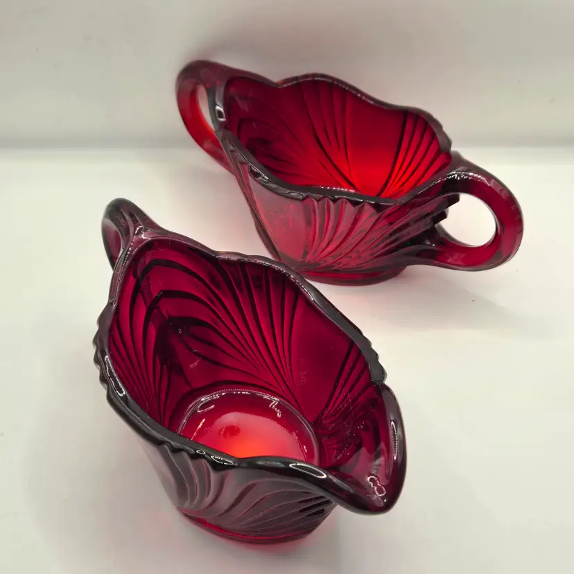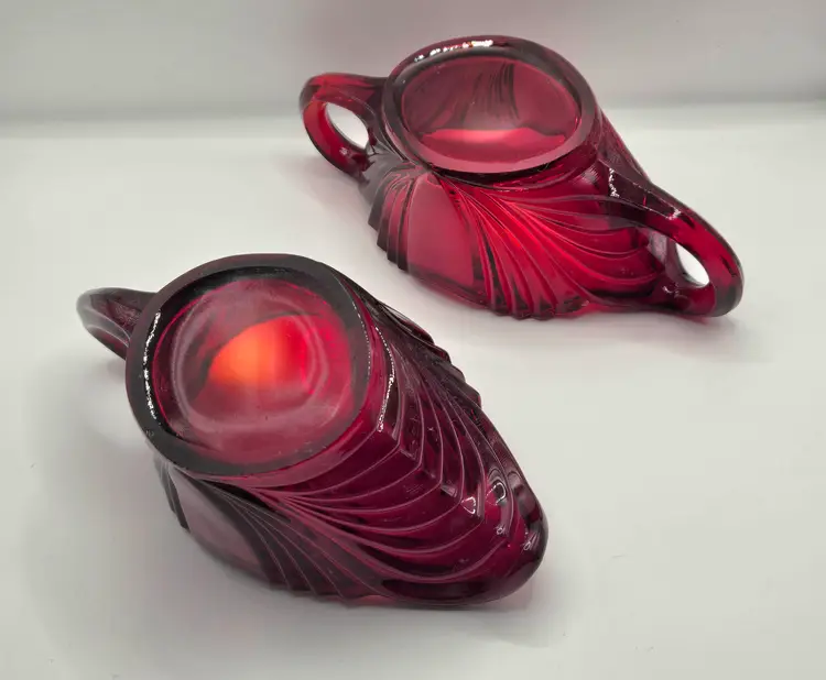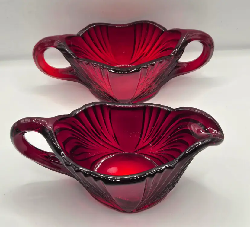 New Martinsville QUEEN ANNE Sugar & Creamer Ruby Red Vintage 1930’s RARE no chips or cracks. Creamer 5.75" x 3" x 2.5" tall. Sugar 6.25" x 2.75" x 2.5" tall. Please see photos as they are part of the description. Item will be well wrapped before shipping. Items from my listings can be combined for shipping if safe to do so.