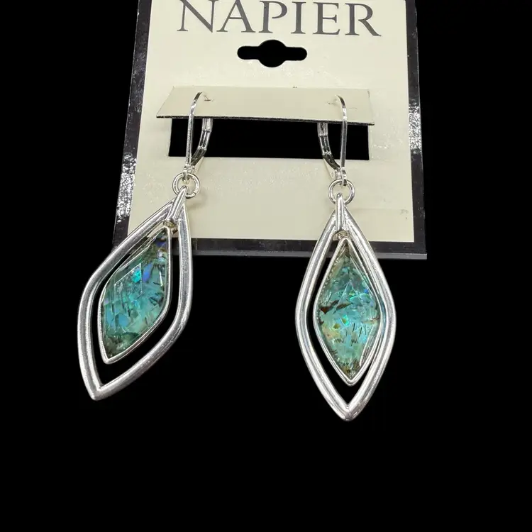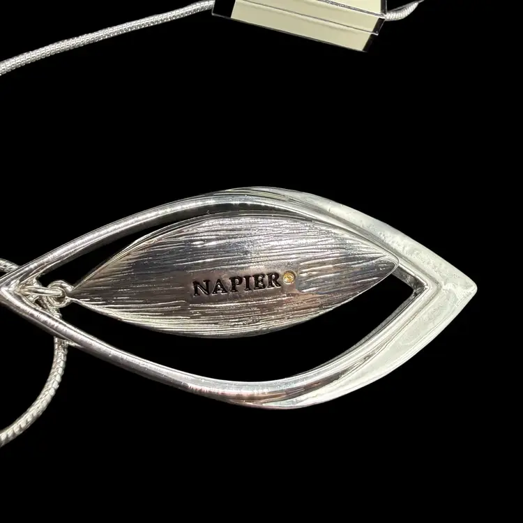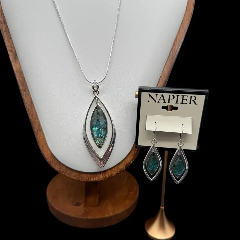 The Napier Orbital Blue Green Necklace & Earrings Set in Silver Tone is a unique and stylish jewelry set that features a teardrop-shaped multicolor pendant in both the necklace and earrings. This set is signed by the brand Napier, known for their quality and craftsmanship. The silver tone metal adds a touch of elegance to the set, making it a perfect accessory for any outfit or occasion. Perfect for those who appreciate vibrant colors and intricate designs in their jewelry.