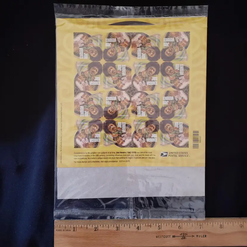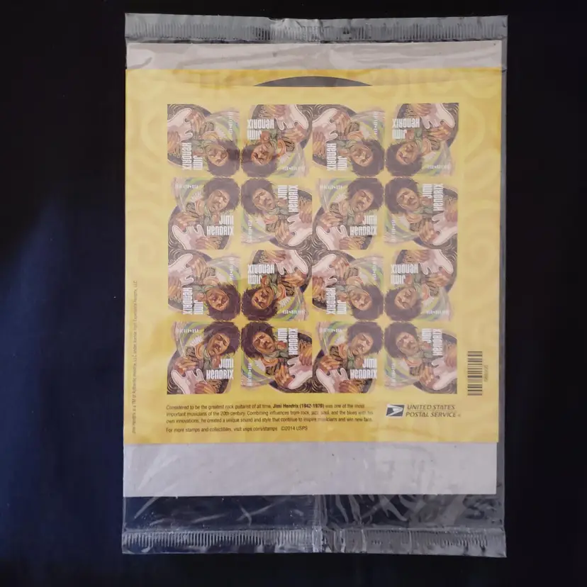 Own a piece of music history with these Jimi Hendrix Forever stamps. These stamps feature the iconic musician and are in mint condition, never hinged. They are perfect for stamp collectors and fans of Jimi Hendrix alike. These stamps are denomination Forever and were produced in the United States in 2014. They are uncirculated and have not been certified. The stamps are in very good grade quality and are suitable for framing or displaying. Celebrate the legacy of Jimi Hendrix with these beautiful stamps.