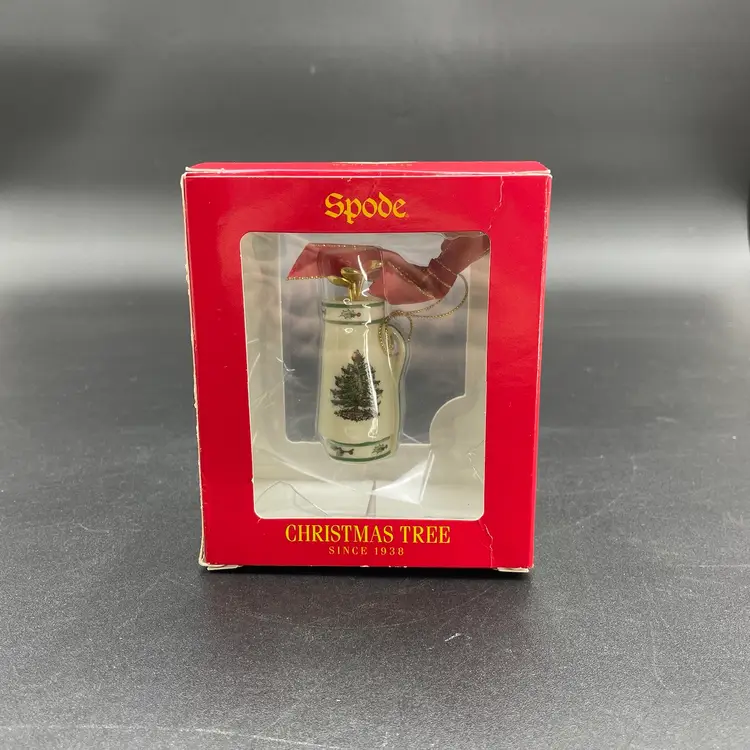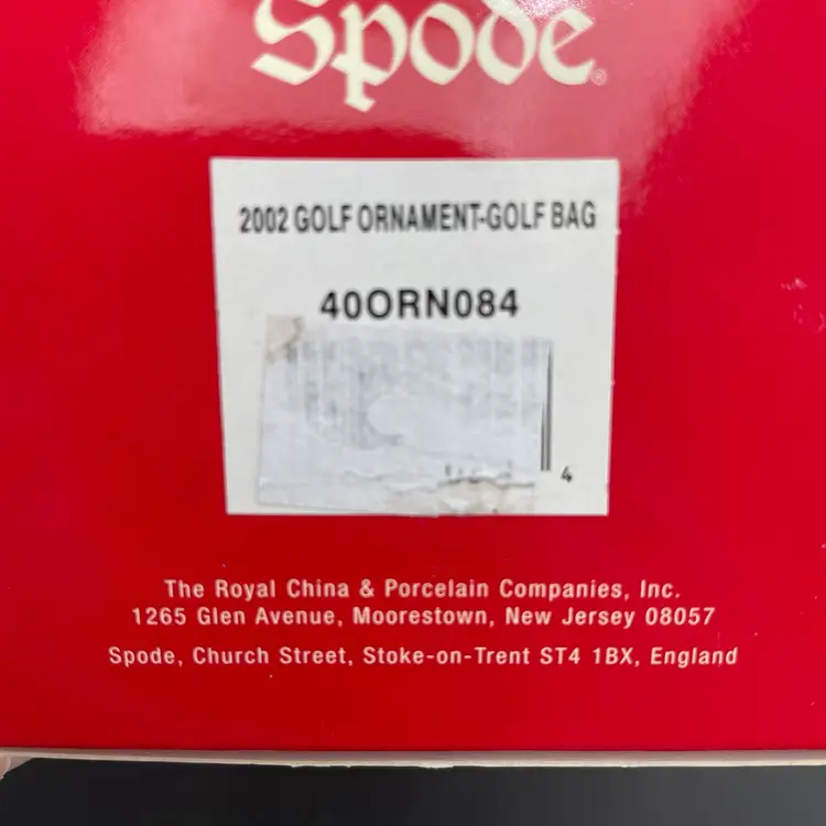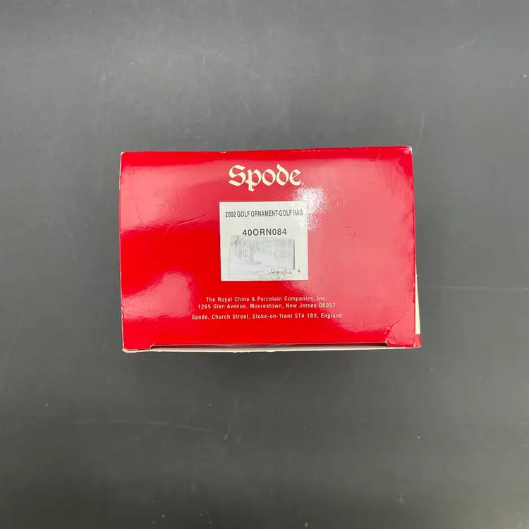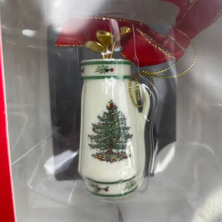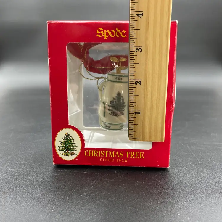 This is a new old stock Spode Porcelain golf bag hanging ornament in its original package. Made in England. The ornament measures approximately 2.5" long. Appears to have no major flaws.