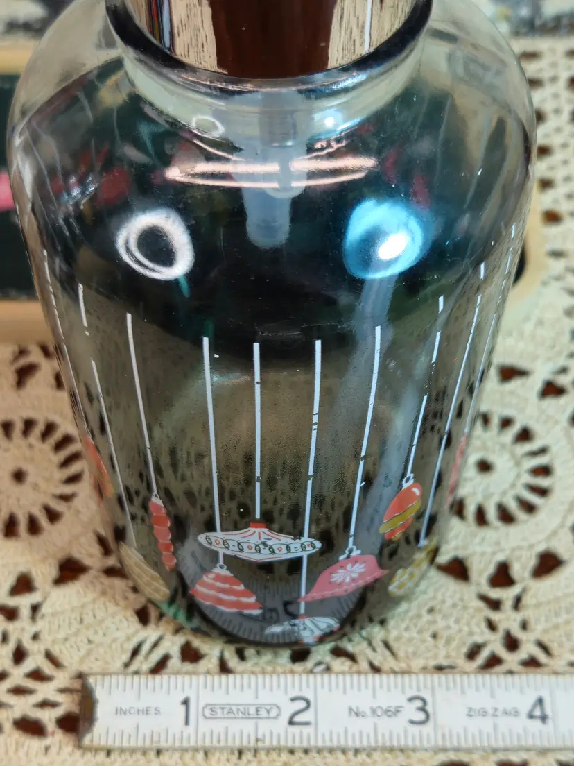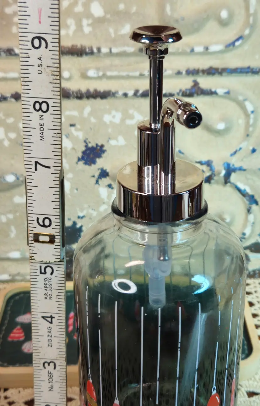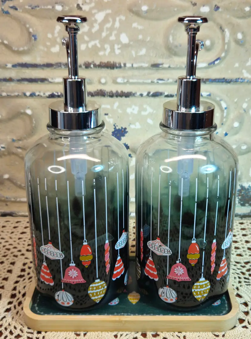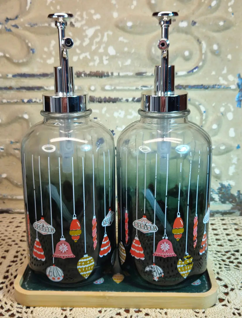 New Pair of Heavy Glass Liquid Soap or Lotion Dispensers w/ Tray Christmas Theme