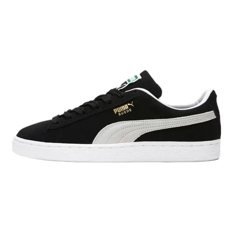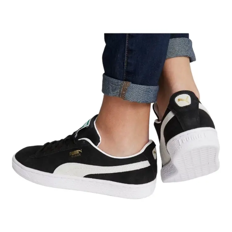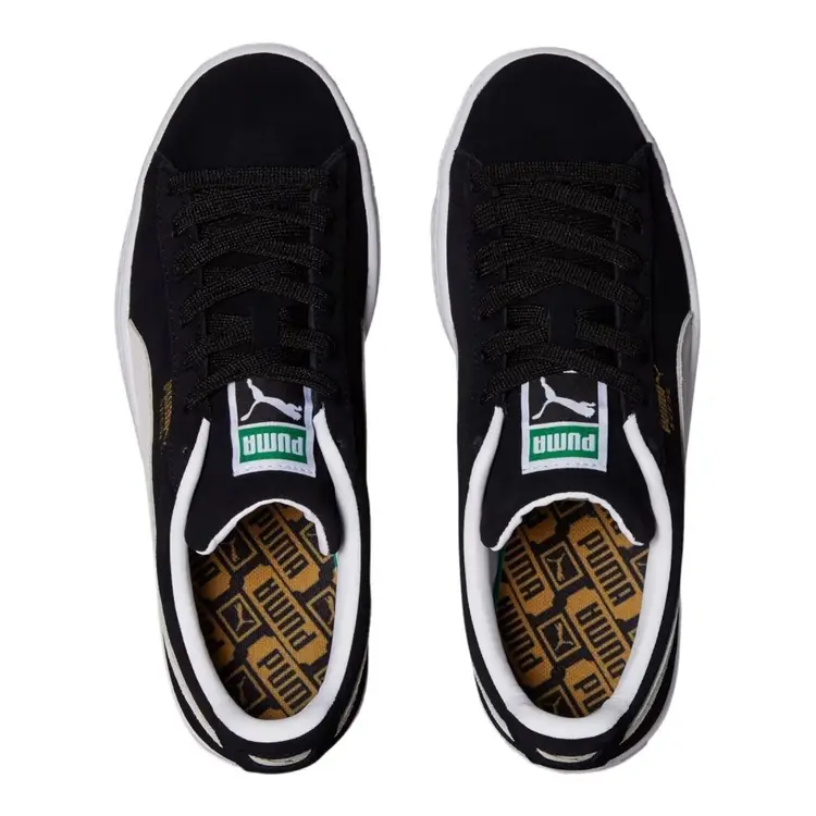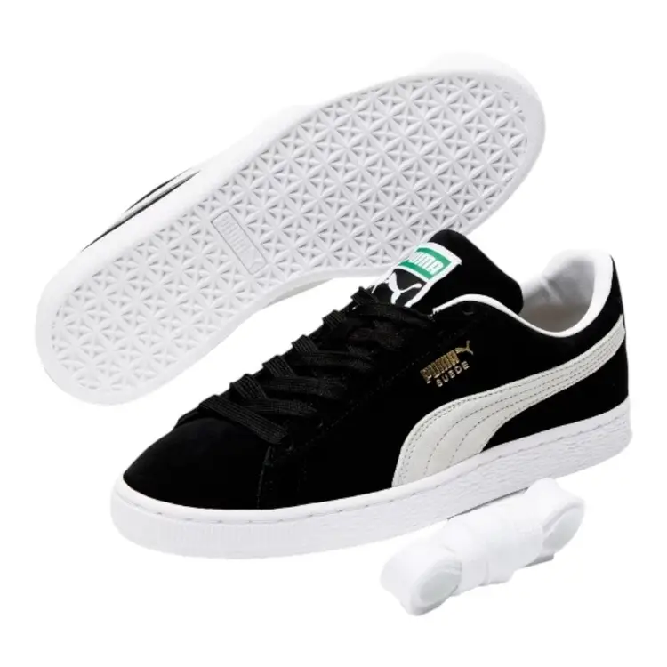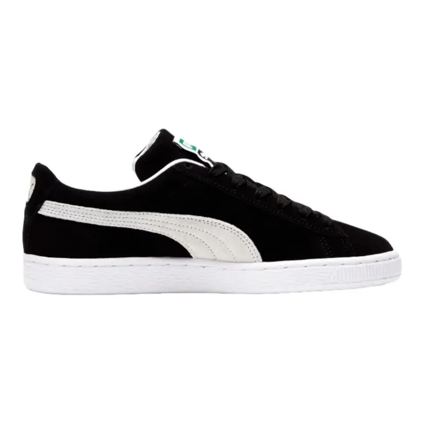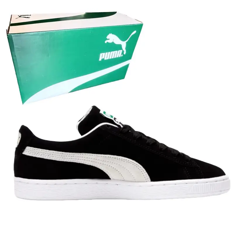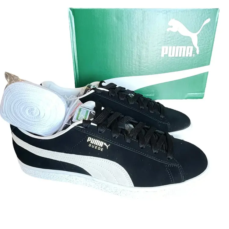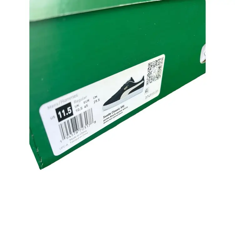 Brand: Puma Color: Black Season: Fall, Spring, Summer, Winter Model: PUMA Suede Classic Closure: Lace Up US Shoe Size: 11.5 Product Line: Puma Suede Classic XXI UK Shoe Size: 10.5 Features: Extra Laces, New In Box!, Unisex Accents: Lace, Extra Laces Vintage: No UPC: 194578723178 Upper Material: Suede Shoe Width: Standard Fabric Type: Suede Leather EU Shoe Size: 45 Occasion: Casual, Travel, Activewear Pattern: Striped MPN: 37491501 Department: Men Style: Sneaker Toe Shape: Almond Toe Type: Casual