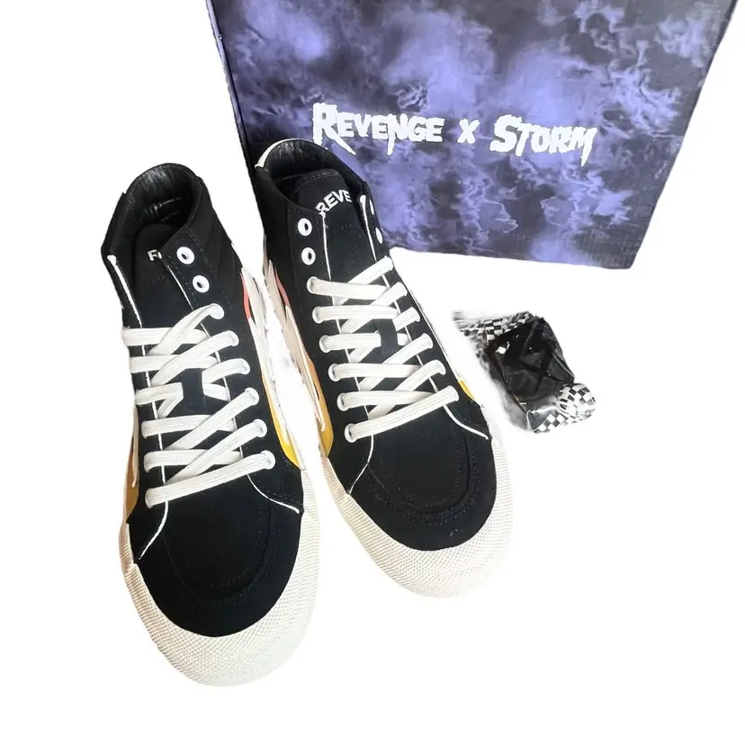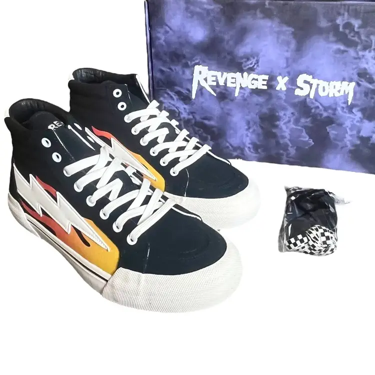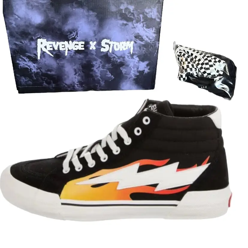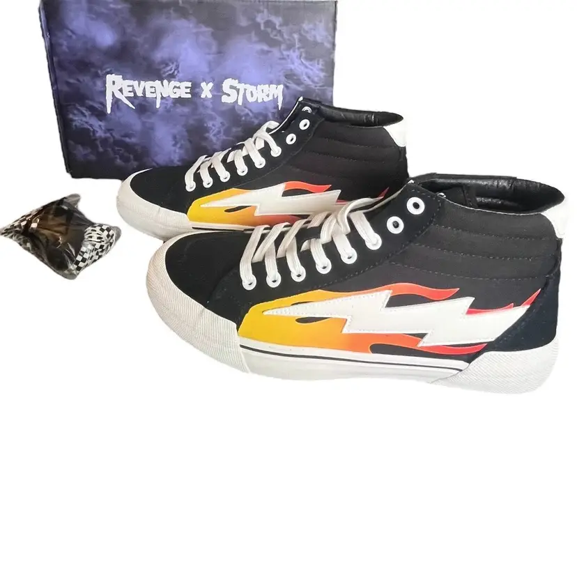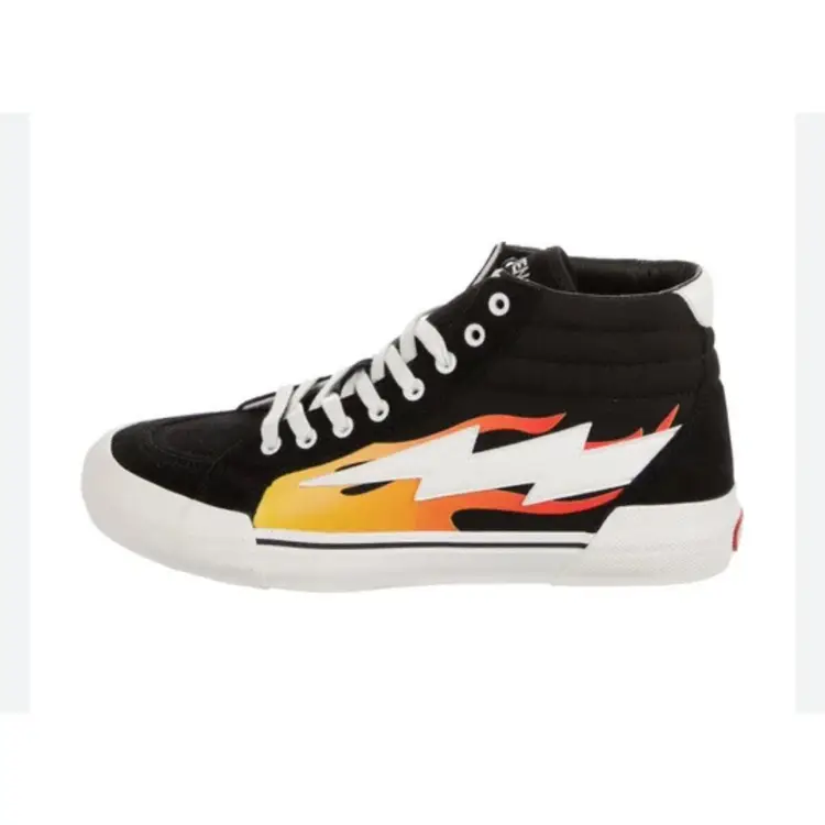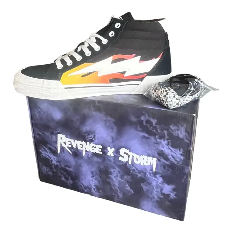 Brand: Revenge X Storm Color: Black Product Line: High Top Flame Features: Adjustable Strap, Breathable, Comfort, Cushioned, Lightweight, 3 Sets of Laces Insole Material: Foam Theme: Athleisure, Outdoor Lining Material: Canvas Model: Revenge Storm High Top Flame Closure: Lace Up Outsole Material: Rubber Upper Material: Canvas Style: Sneaker Performance/Activity: Walking, Basketball, Skateboarding, School Department: Unisex Adults Occasion: Activewear, Casual Pattern: Solid Season: Fall, Spring, Summer, Winter Shoe Shaft Style: High Top UK Shoe Size: 8 Type: Athletic US Shoe Size: 9 Shoe Width: Standard EU Shoe Size: 42 Vintage: No