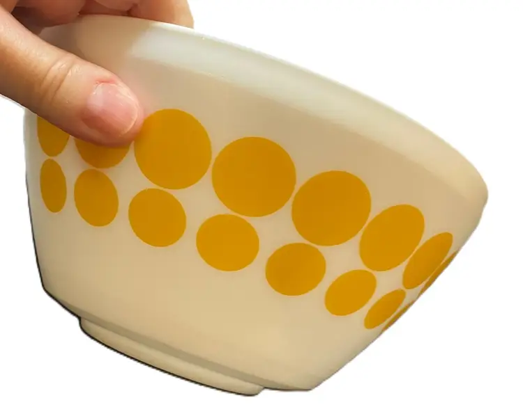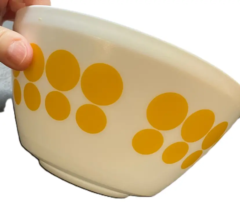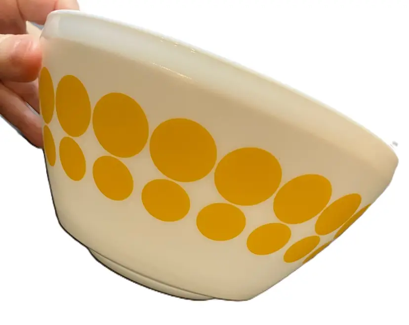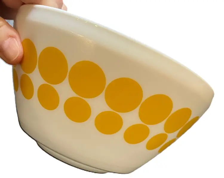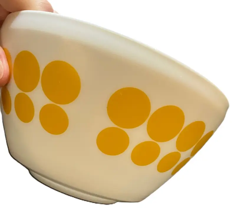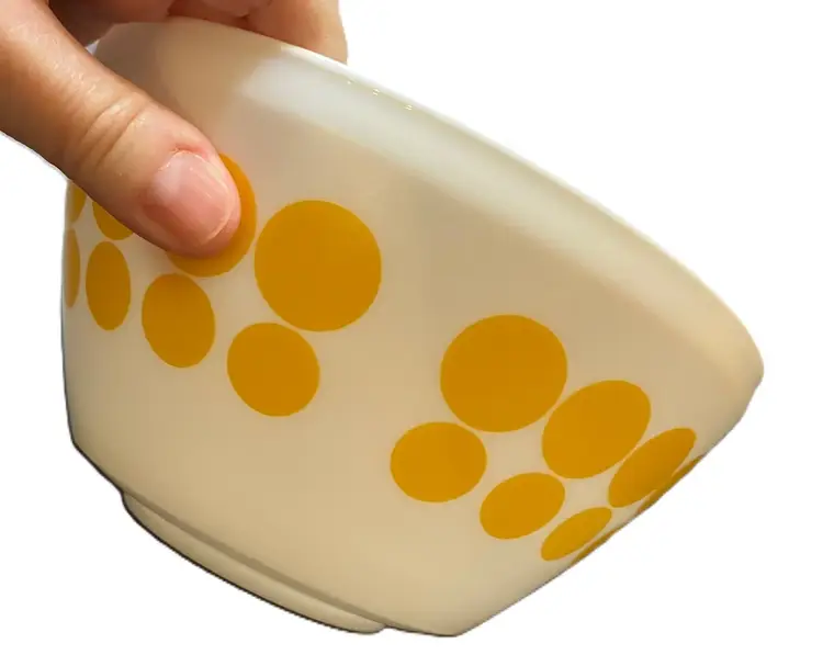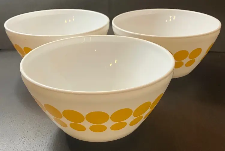 The bowl is made of milk glass and features solid yellow dots in rows around the exterior. 1.4L Still has stickers on the bottom. No condition issues. Measures 7" diameter and 3 3/4" tall. Weighs about 4 lbs before packaging. If you would like to purchase less than 3 bowls, please contact me and I list the bowls separately.