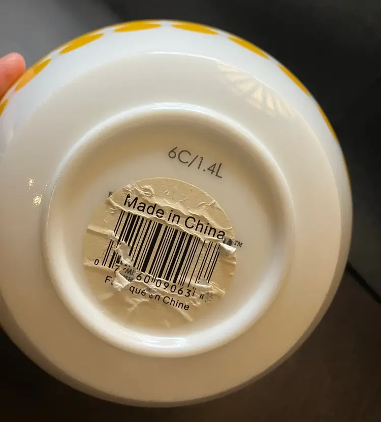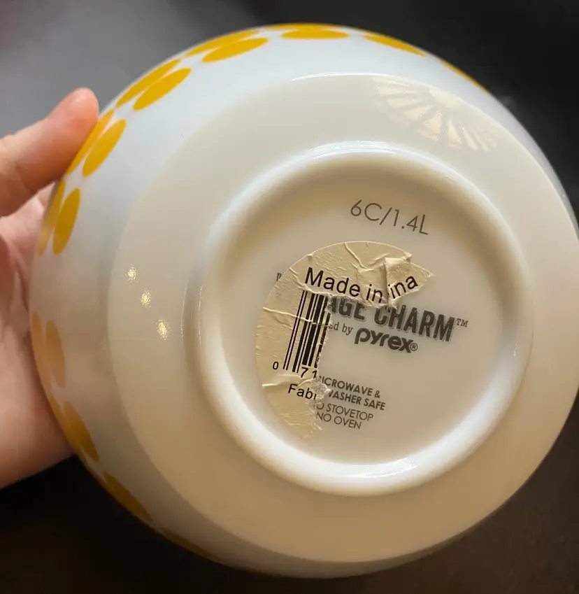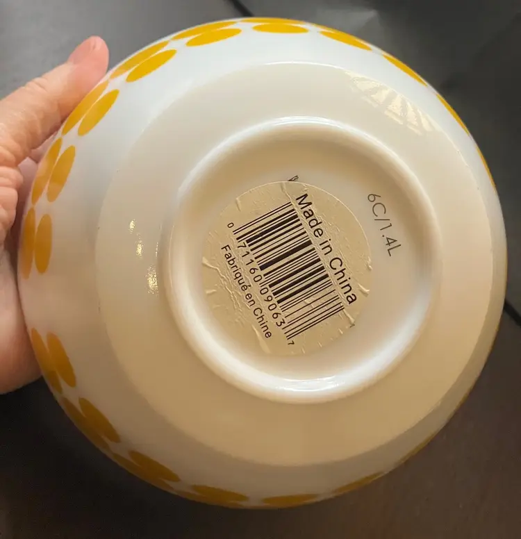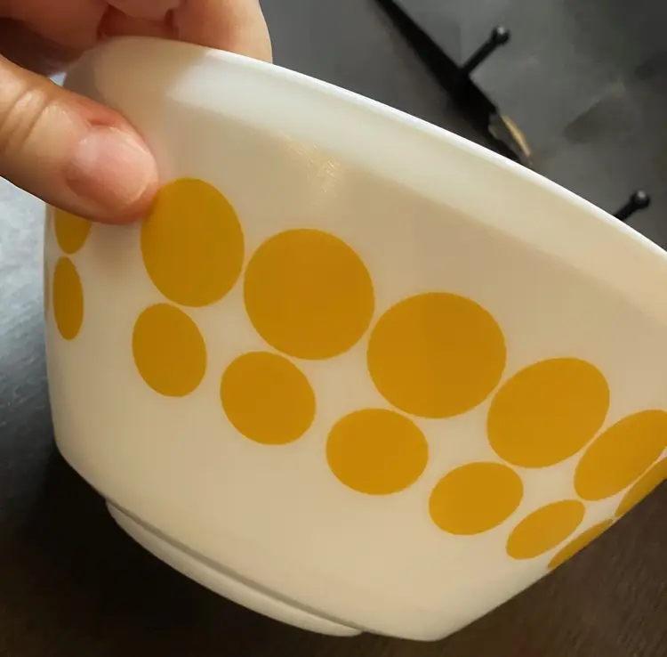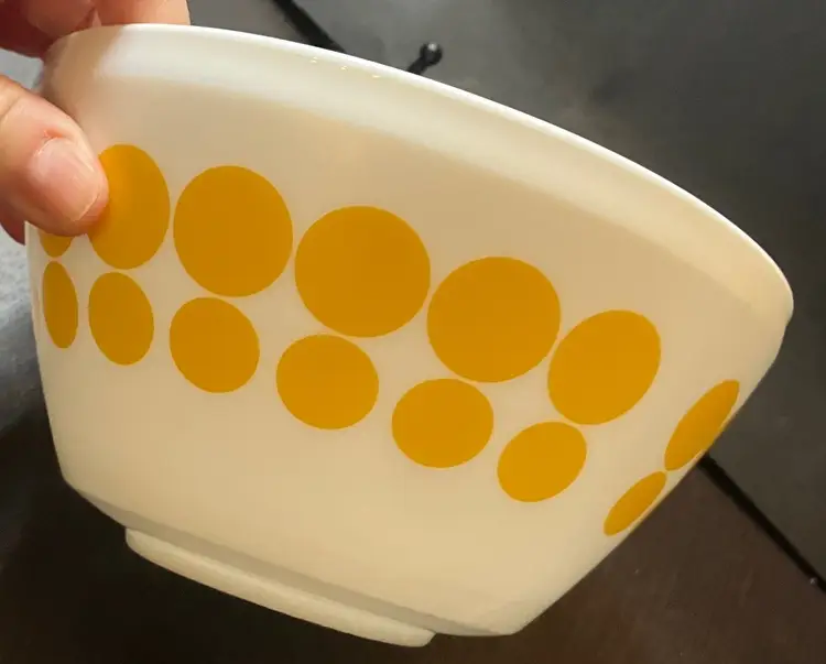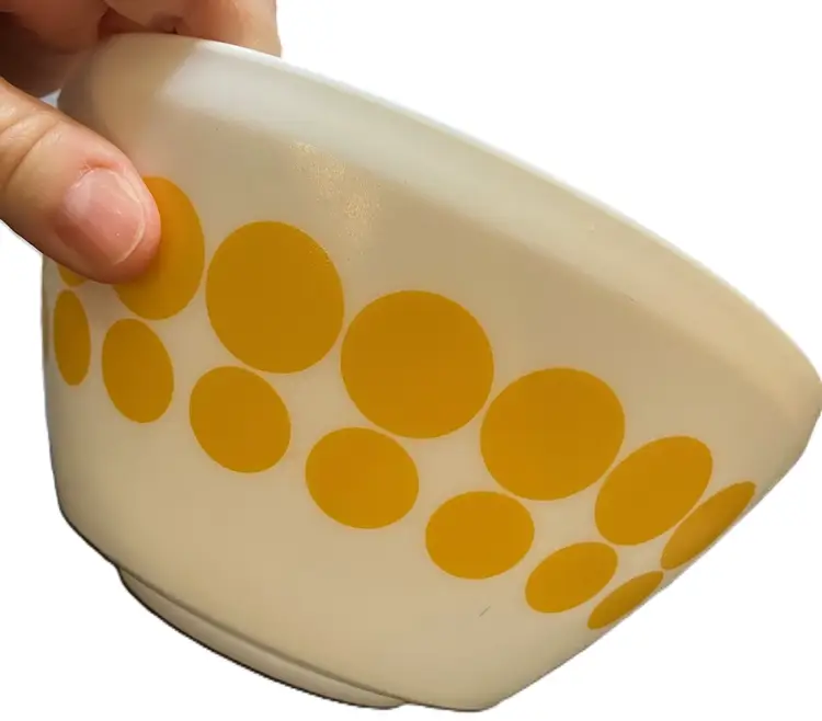 The bowl is made of milk glass and features solid yellow dots in rows around the exterior. 1.4L Still has stickers on the bottom. No condition issues. Measures 7" diameter and 3 3/4" tall. Weighs about 4 lbs before packaging. If you would like to purchase less than 3 bowls, please contact me and I list the bowls separately.