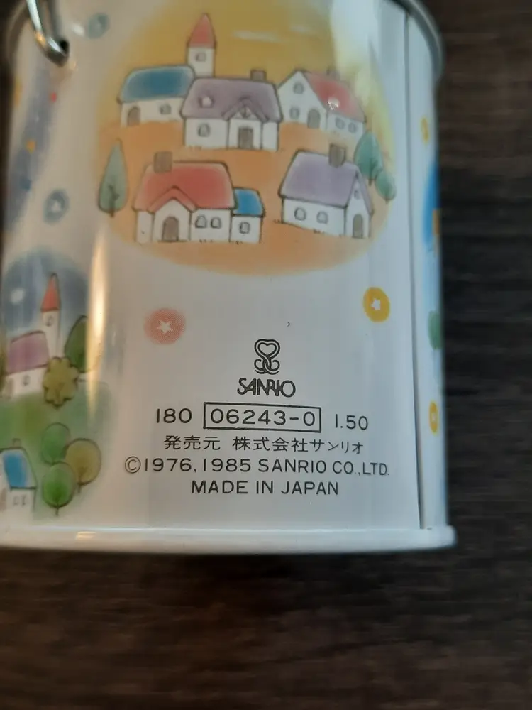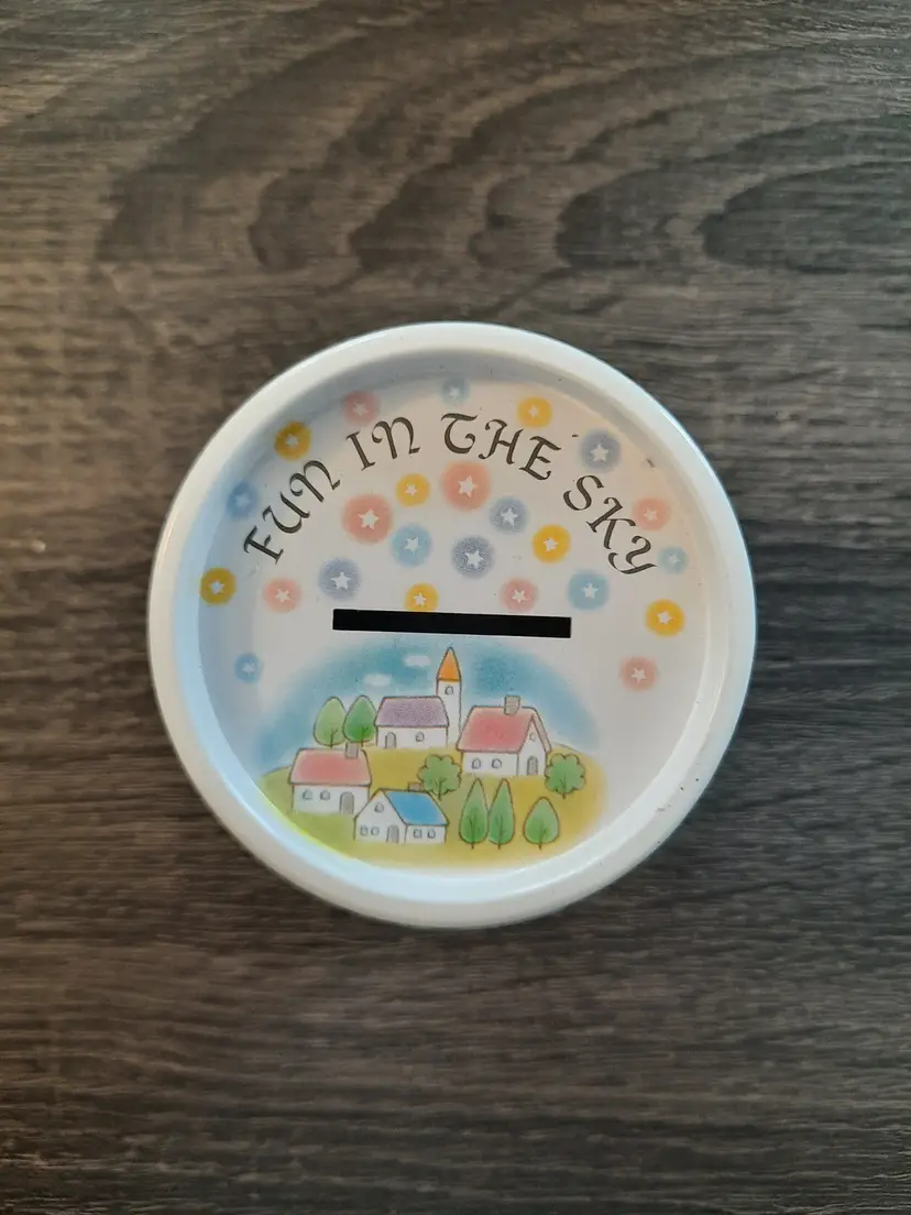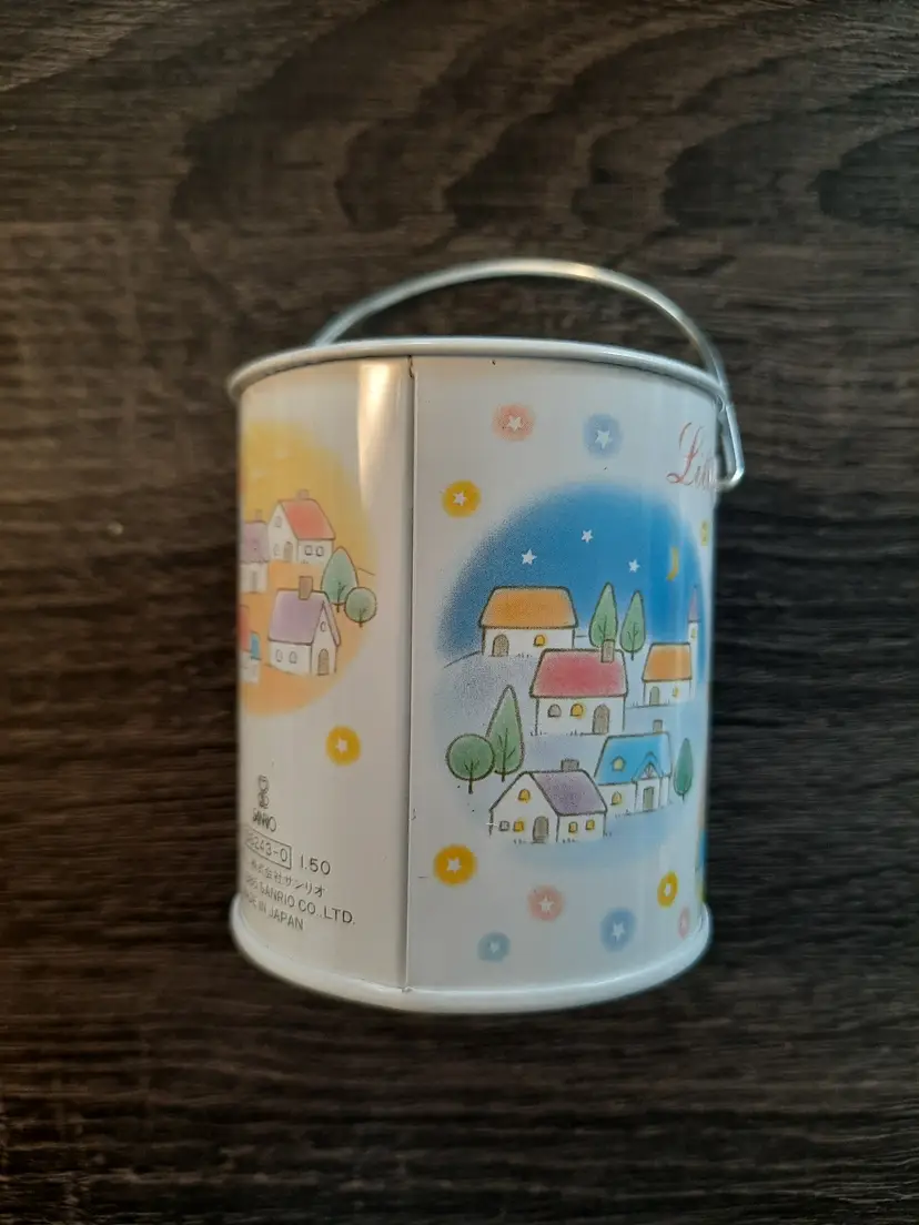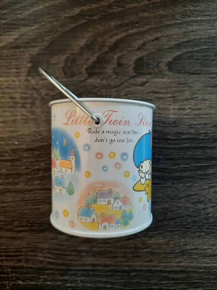 Adorable coin bank with handle and removable lid. The Little Twin Stars are riding a star in the sky with scenes of various houses and towns. " Ride a magic star but don't go too far." is the written on the side of the bank. The lid reads "FUN IN THE SKY".
