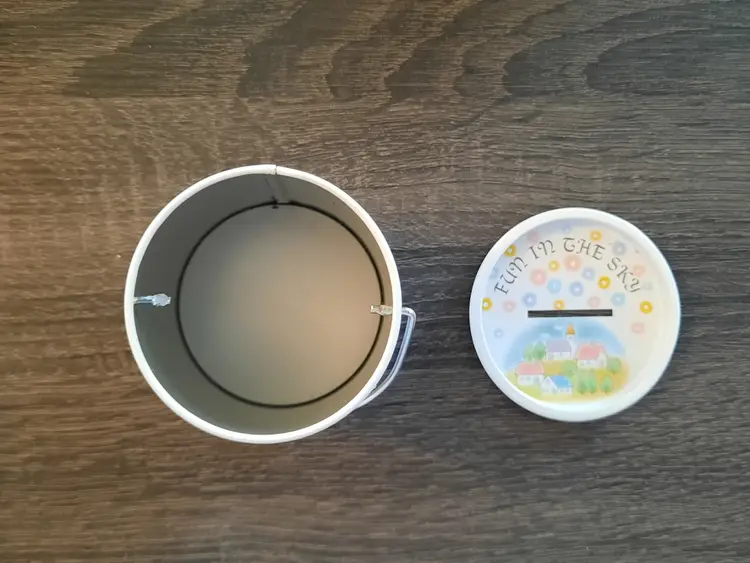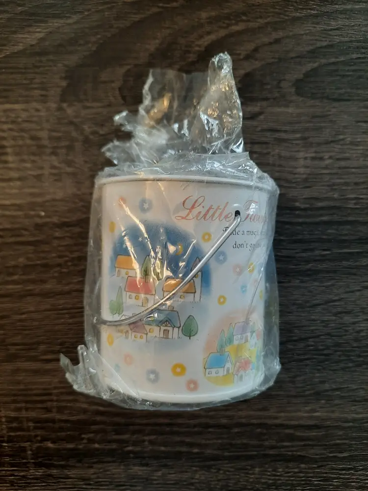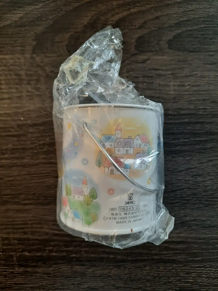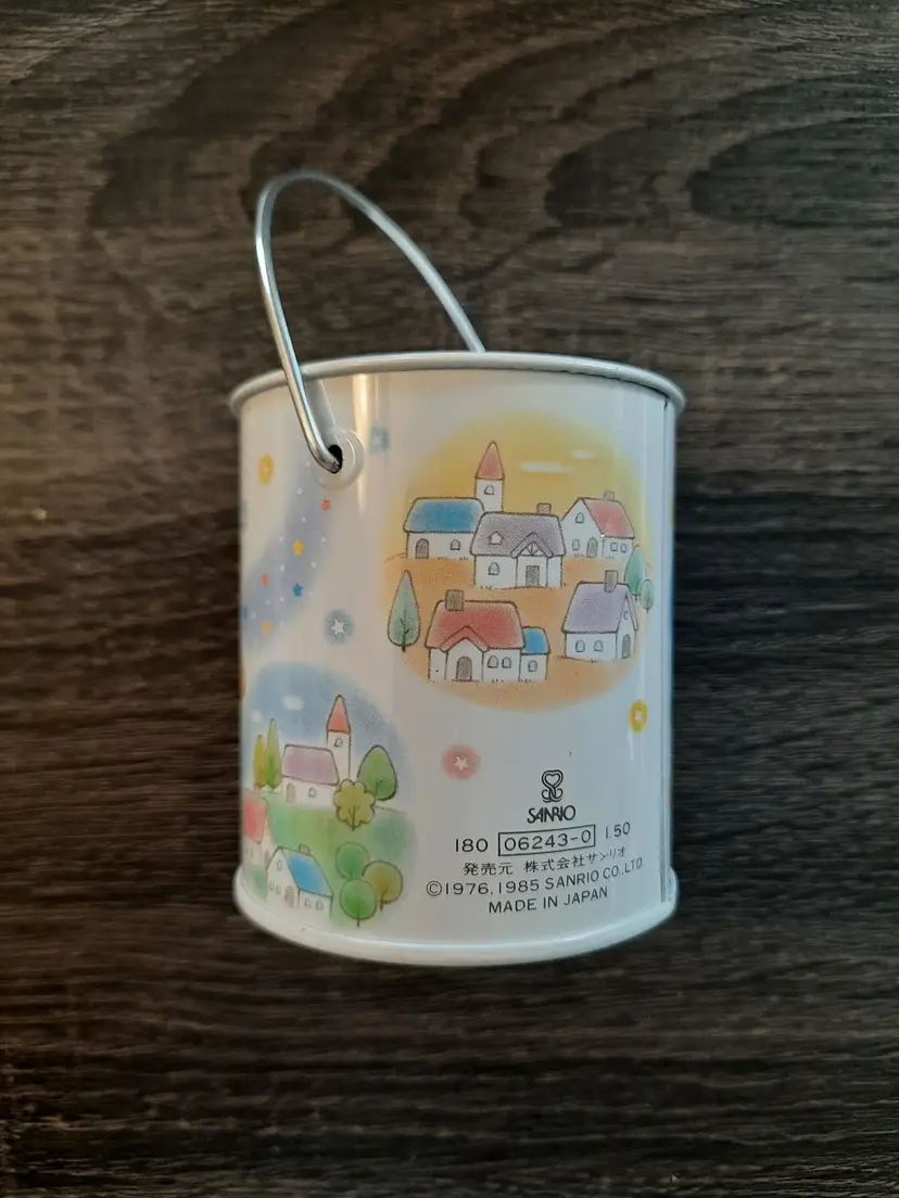 Adorable coin bank with handle and removable lid. The Little Twin Stars are riding a star in the sky with scenes of various houses and towns. " Ride a magic star but don't go too far." is the written on the side of the bank. The lid reads "FUN IN THE SKY".