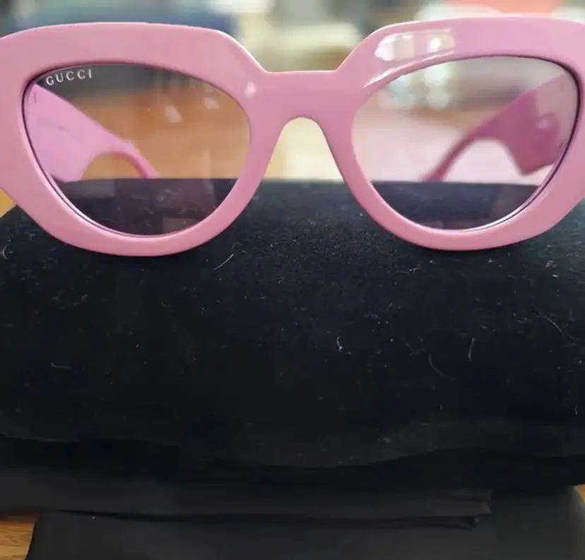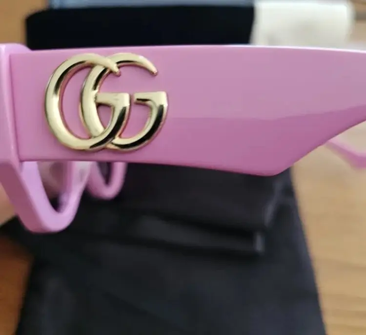 These Gucci glasses boast a stylish pink frame adorned with luxurious gold accents, embodying the brand's iconic elegance. The design is a perfect blend of modern sophistication and timeless appeal, making them an essential accessory for any fashion enthusiast. Elevate your look with these standout glasses that reflect Gucci's renowned craftsmanship.