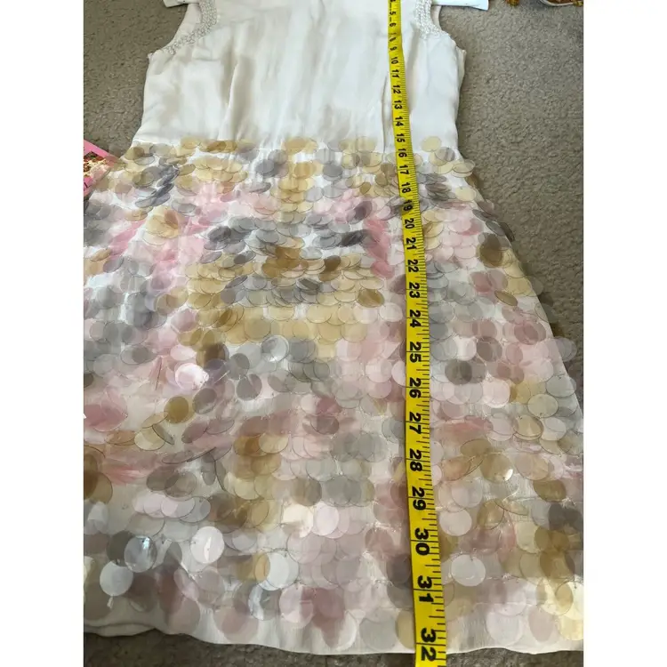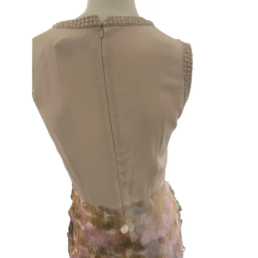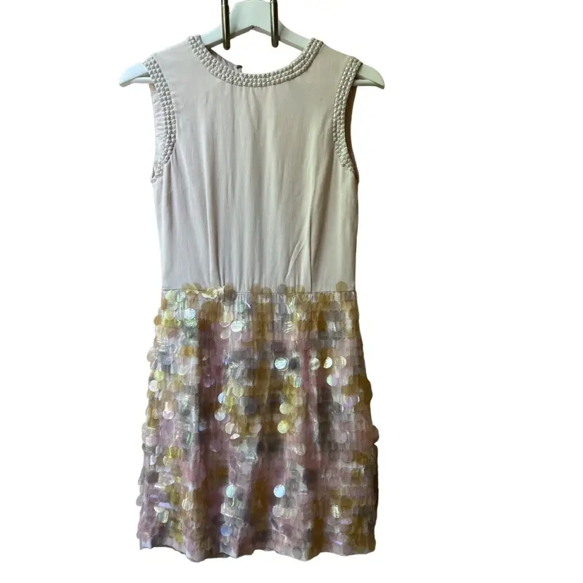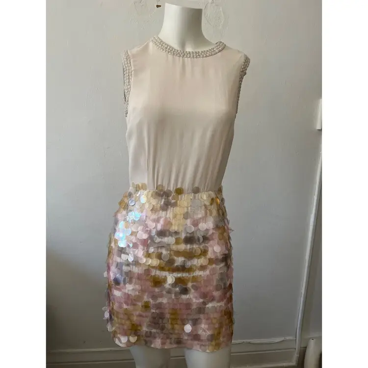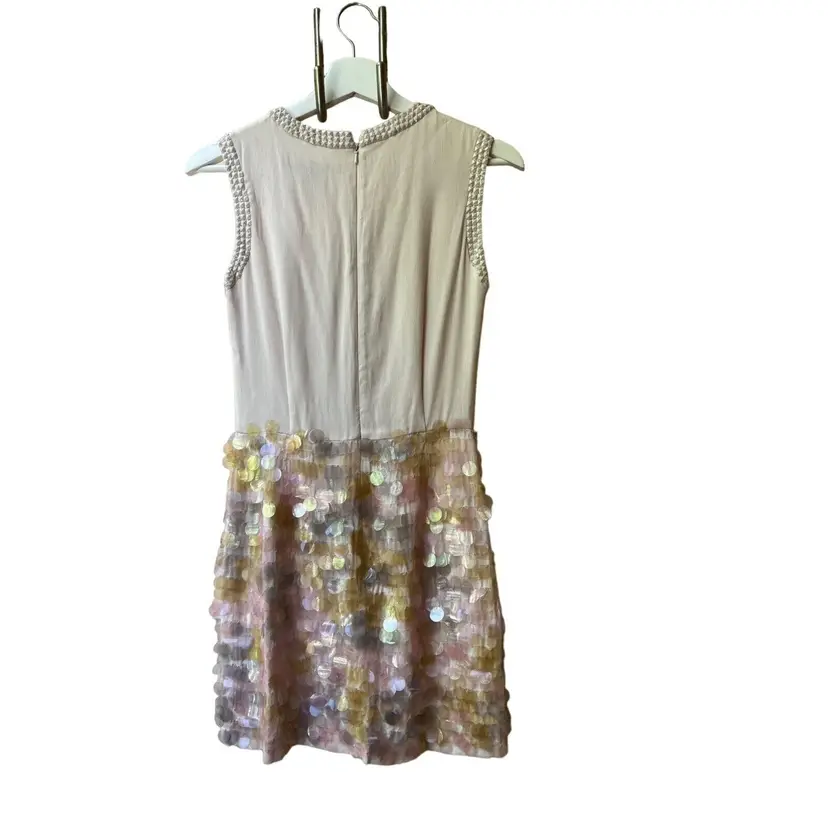 Pattern: Geometric Sleeve Length: Sleeveless Closure: Zip Neckline: Scoop Neck Size: 2 Color: Pink and Cream Material: Viscose Rayon Polyester Accents: Beaded Dress Length: Short Brand: French Connection Size Type: Regular Department: Women Style: Mini