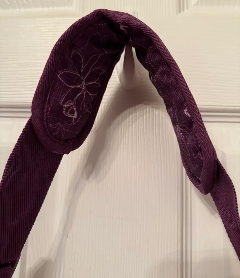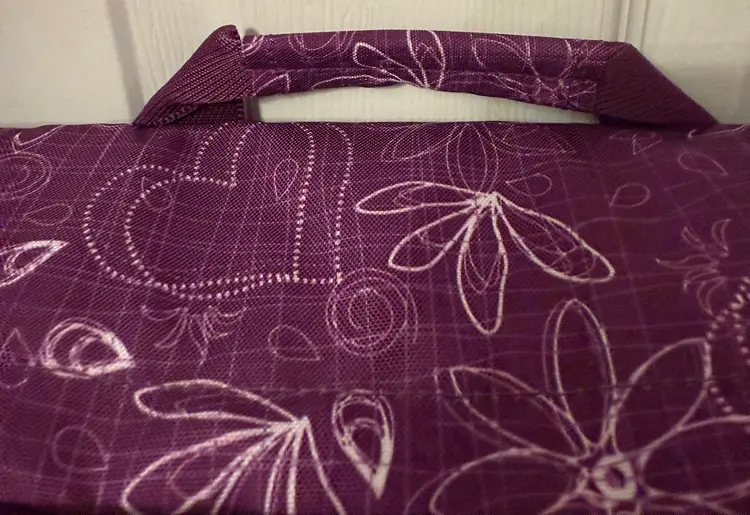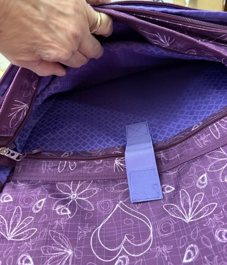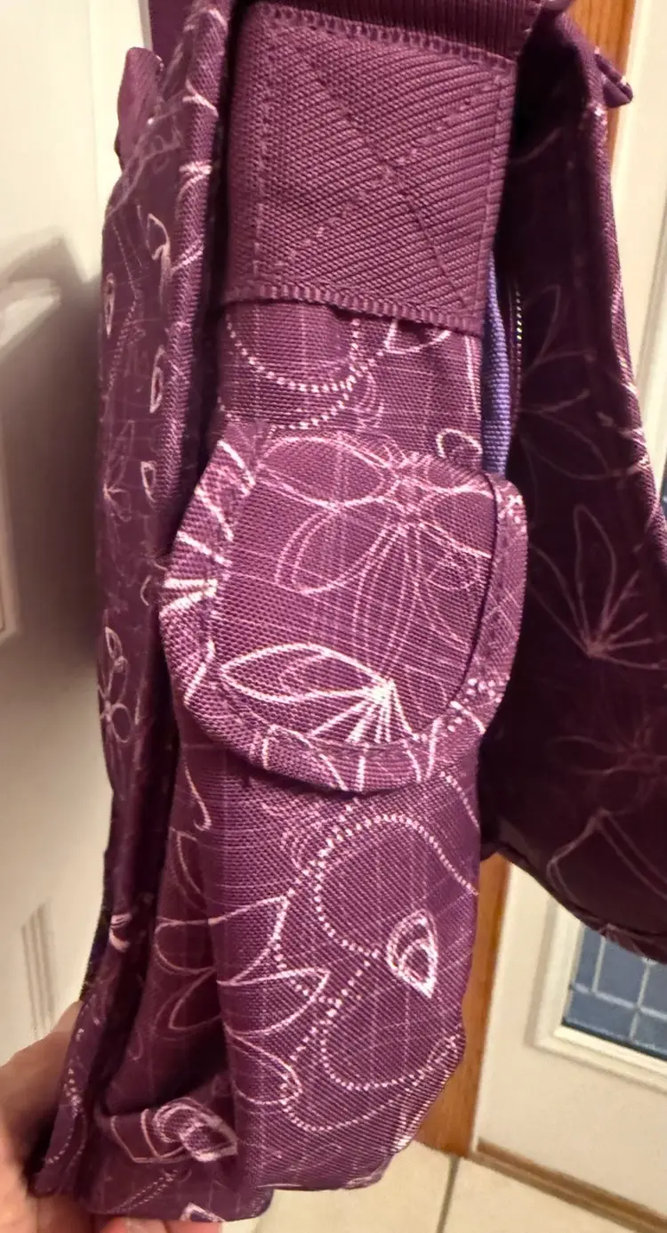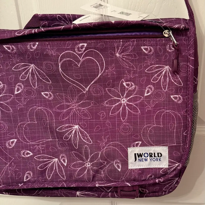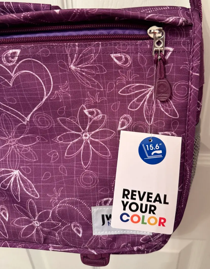 Purple w/sketches of hearts & flowers in white Excellent, like new condition Outside flap has zipper compartment, & connected by 2 clips 2 zipper compartments on both exterior sides Mesh pocket on one end, flap pocket on other Attached handle. Adjustable shoulder strap w/ shoulder pad. Interior, padded divider Tab inside to secure laptop Well constructed, fits regular laptop size 15.6" comfortably. Approximate measurements: Drop: 23" (longest) H: 12" L: 16" W: 4.25"