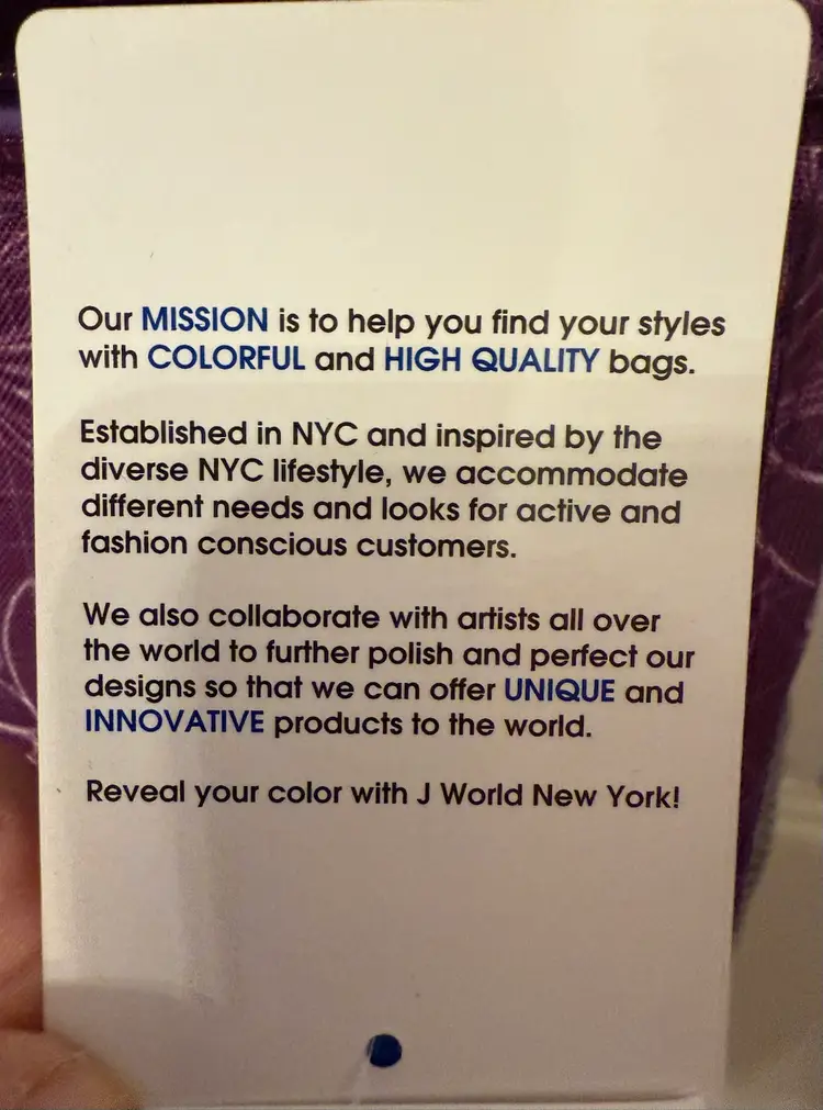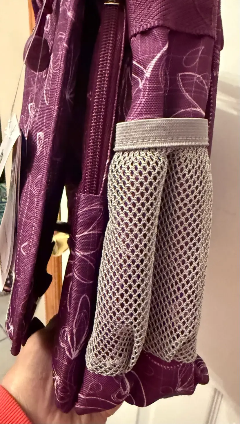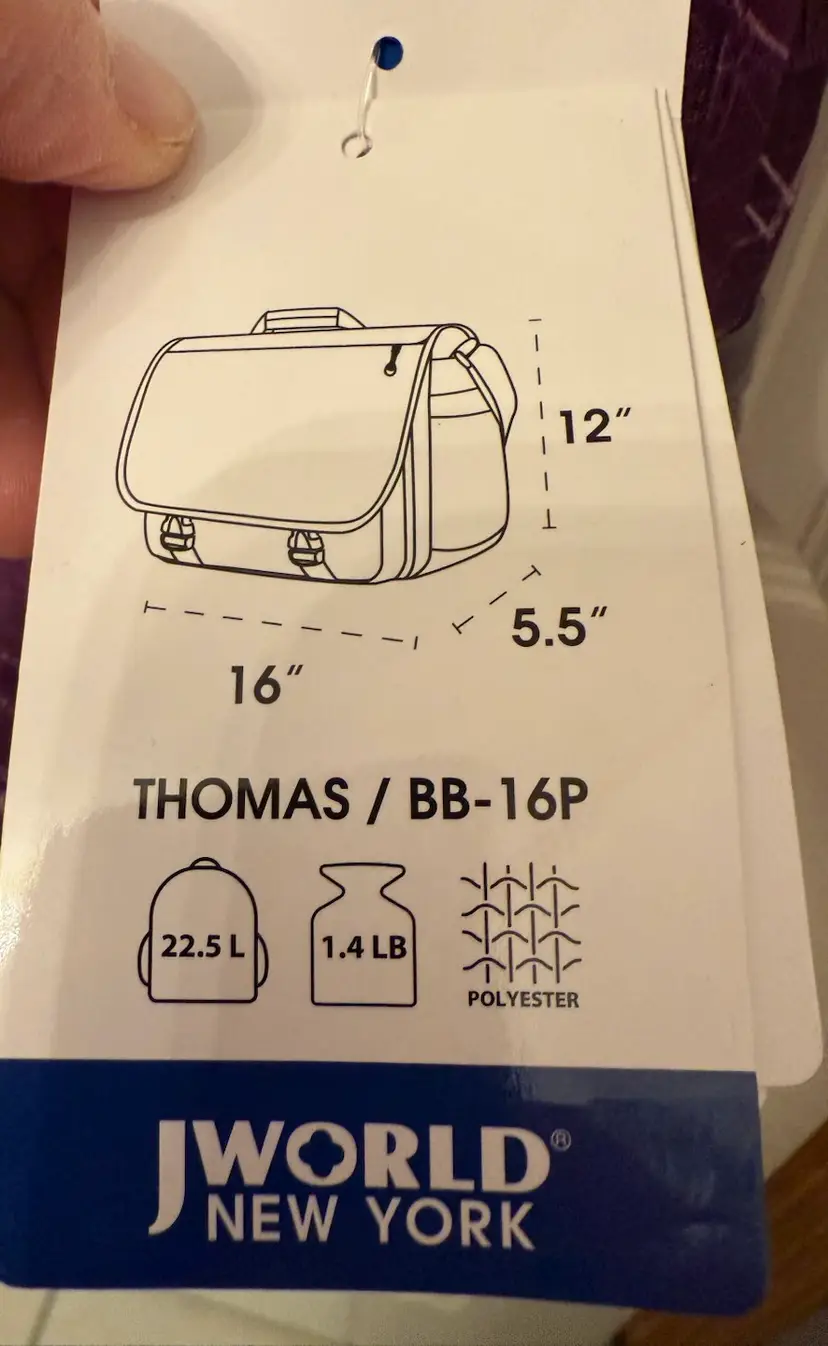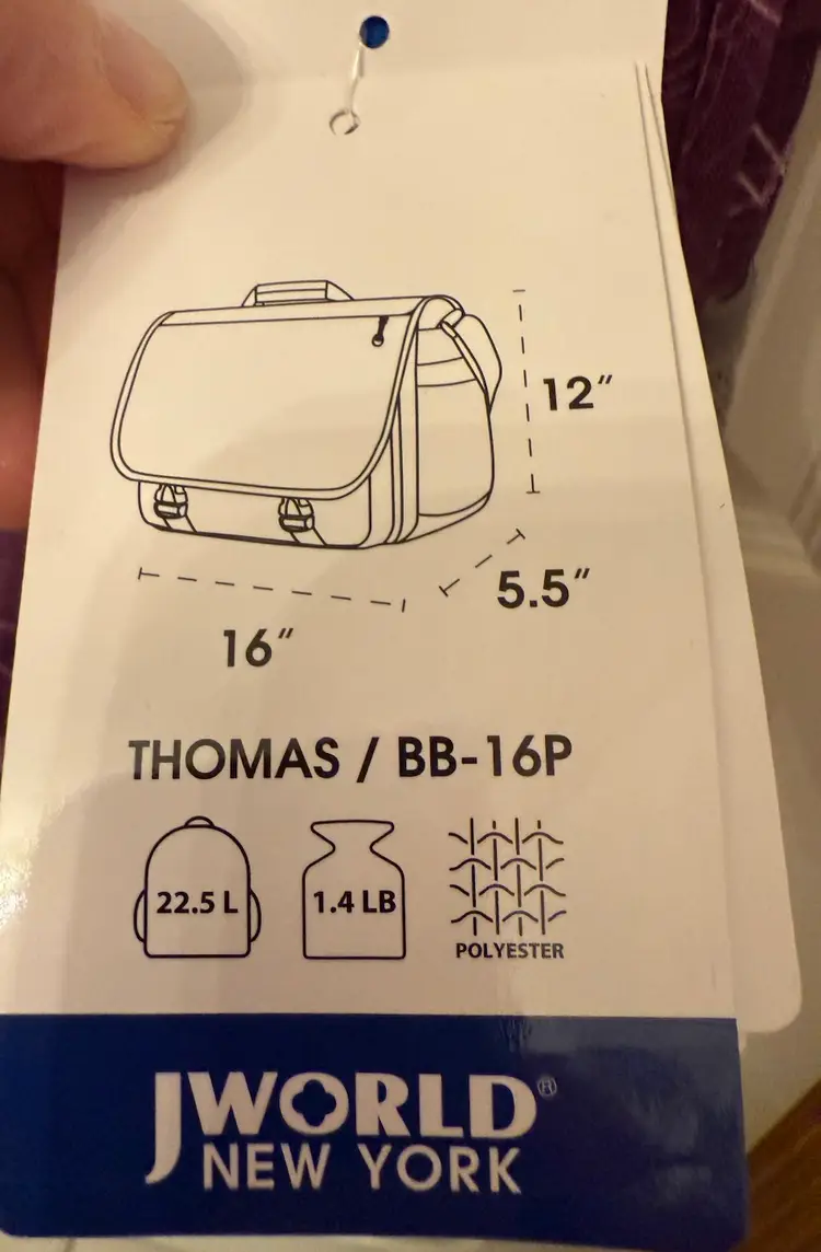Purple w/sketches of hearts & flowers in white Excellent, like new condition Outside flap has zipper compartment, & connected by 2 clips 2 zipper compartments on both exterior sides Mesh pocket on one end, flap pocket on other Attached handle. Adjustable shoulder strap w/ shoulder pad. Interior, padded divider Tab inside to secure laptop Well constructed, fits regular laptop size 15.6" comfortably. Approximate measurements: Drop: 23" (longest) H: 12" L: 16" W: 4.25"