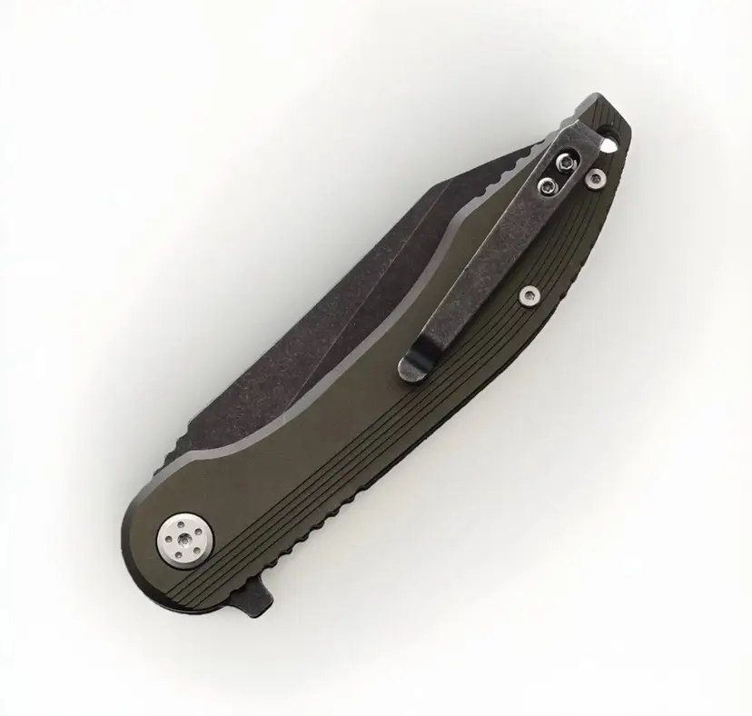 Gasper Linerlock 4.5" (11.43cm) closed. 3.5" (8.89cm) black stonewash finish D2 tool steel blade. Green aluminum handle. Extended tang. Lanyard hole. Pocket clip. Boxed.