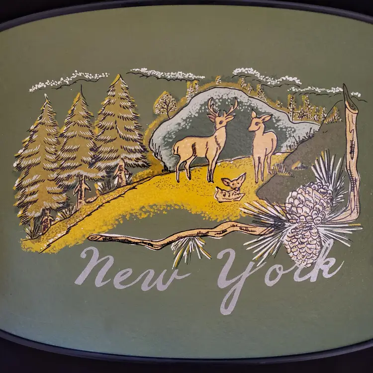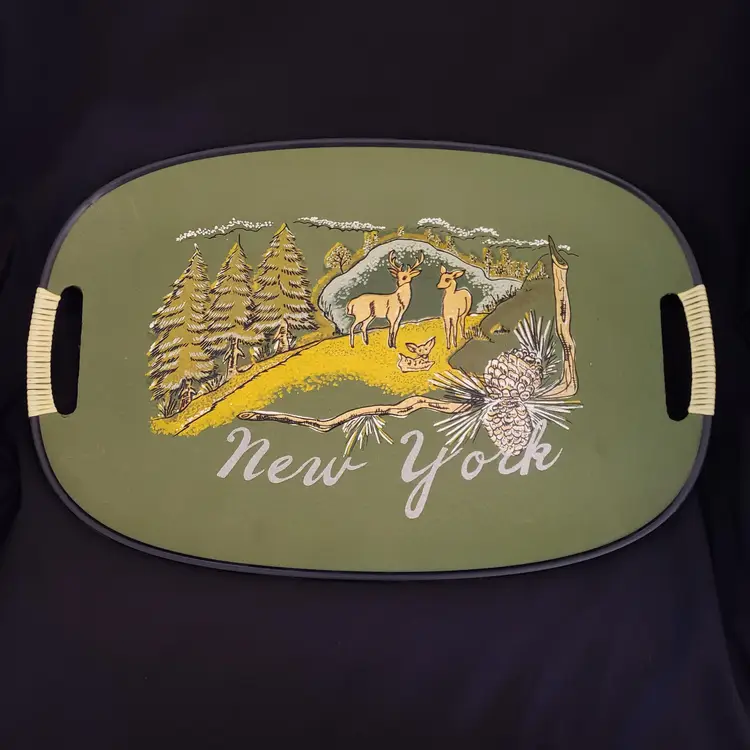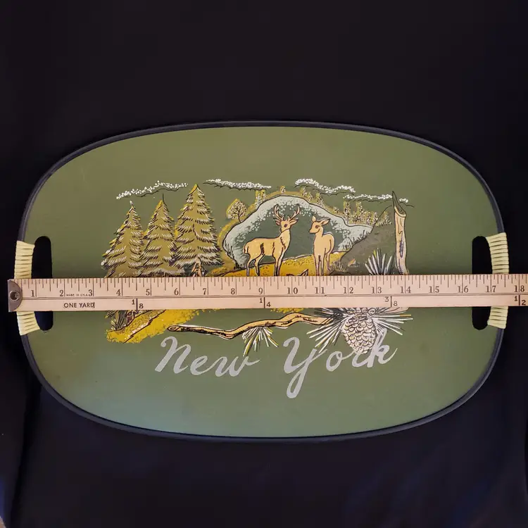 New York Souvenir Serving Tray Mid-century 60's Illustrated Made In Japan 17¾" long. Used condition with some dirt, edgewear, chips especially on backside, scratches, scuffs, etc. Please view all the photos and read the entire item description and please ask any questions prior to purchase when possible.