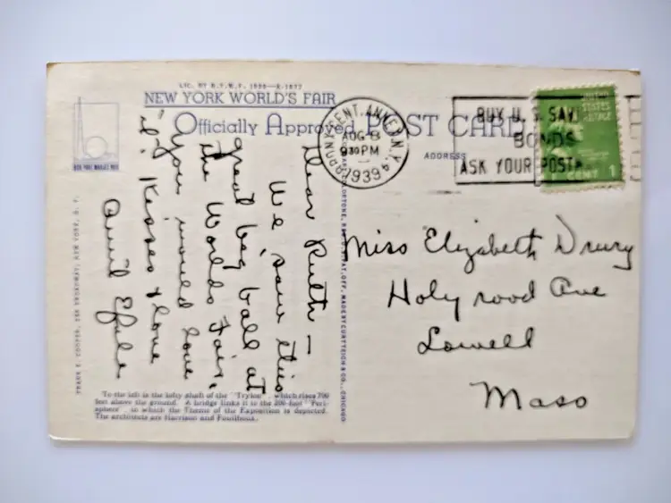 Number of Items in Set: 1 Unit of Sale: Single Unit Artist: Unknown Occasion: Sayings & Quotes Size: Standard (5.5 x 3.5 in) Signed: No Custom Bundle: No Year Manufactured: 1939 Material: Paper Original/Licensed Reprint: Original Franchise: Unknown Brand/Publisher: Curt Teich Subject: Worlds Fair Personalize: No Type: Linen Postcard Era: Linen (1930-1945) Theme: Architecture, Art, Cities & Towns, Exhibitions, Exposition, Famous Places, Greetings, Roadside America, Technology, Tourism, Buildings, New York Worlds Fair, Modernism Features: Divided Back Time Period Manufactured: 1930-1939 Country/Region of Manufacture: United States Postage Condition: Posted