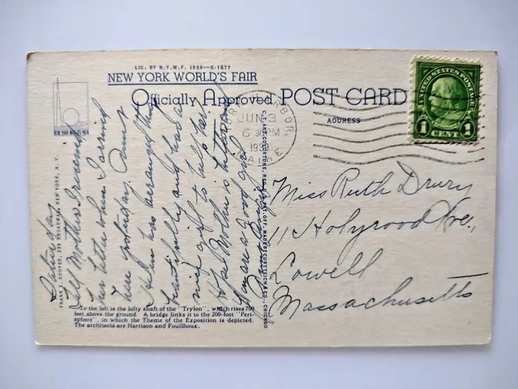 Number of Items in Set: 1 Unit of Sale: Single Unit Artist: Unknown Occasion: Sayings & Quotes Size: Standard (5.5 x 3.5 in) Signed: No Custom Bundle: No Year Manufactured: 1939 Material: Paper Original/Licensed Reprint: Original Franchise: Unknown Brand/Publisher: Curt Teich Subject: Worlds Fair Personalize: No Type: Linen Postcard Era: Linen (1930-1945) Theme: Architecture, Art, Cities & Towns, Exhibitions, Exposition, Famous Places, Greetings, Roadside America, Technology, Tourism, Buildings, New York Worlds Fair, Modernism Features: Divided Back Time Period Manufactured: 1930-1939 Country/Region of Manufacture: United States Postage Condition: Posted