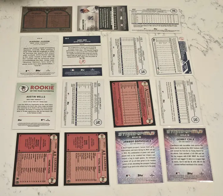 2024 Topps Series 2 Mickey Mantle All Star #89ASB-48 2024 Topps Series 2 Babe Ruth All Star #89ASB-17 2024 Topps Series 2 Jasson Dominguez Stars of MLB #SMLB-35 2024 Topps Series 2 Gerrit Cole Stars of MLB Chrome #CSMLB-36 2024 Topps Series 2 Austin Wells 1989 Anniversary RC #89B2-36 2024 Topps Series 2 Austin Wells RC Base #624 2024 Bowman Austin Wells ROY Favorites #ROY-2 2024 Topps Series 1 Anthony Volpe Future Stars #180 2023 Topps Series 1 Oswald Peraza RC Base #94 2024 Topps Series 2 Oswald Peraza Rainbow Foil #459 2023 Topps Stadium Club Anthony Rizzo Sepia #237 2024 Topps Heritage Then and Now - Juan Soto and Joe Morgan - #TAN-3 2024 Topps Series 2 Aaron Judge Significant Statistics #SS-8 2024 Topps Series 2 Aaron Judge City to City #CTC-8 2024 Topps Flagship Collection Aaron Judge Companion Card #CTC-7
