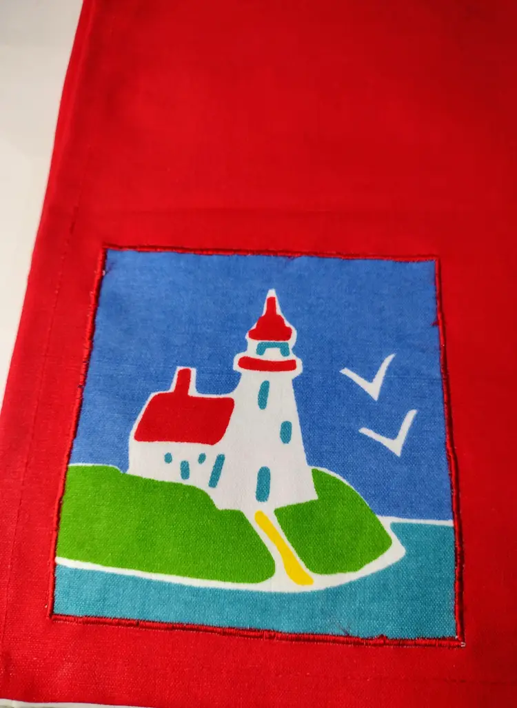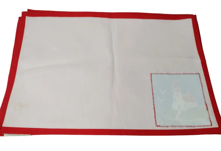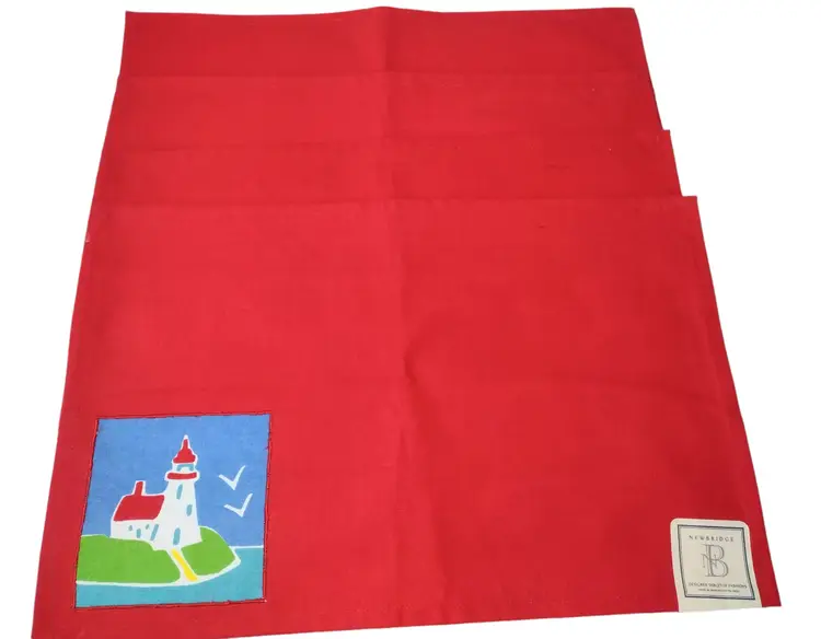 Items are new with tags and in a smoke free environment. There is one tiny hole through the corners where the tag was. These are very nice nautical placemats that measure 19" long x 13" wide. The lighthouse has an embroidered edge. There is no care tag, but since there is embroidery, I would hand wash or wash on gentle.