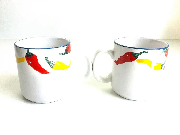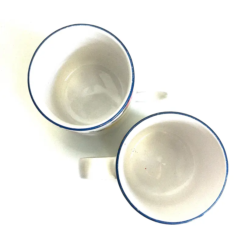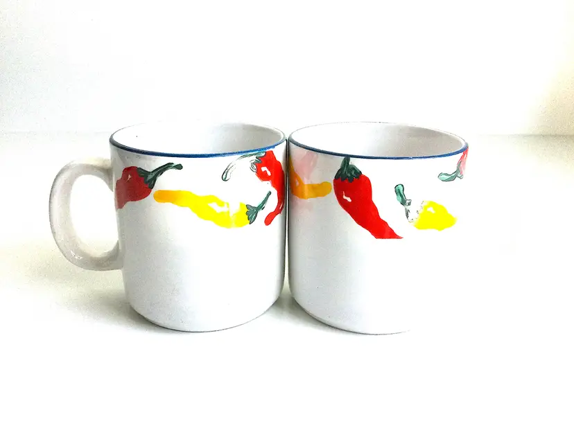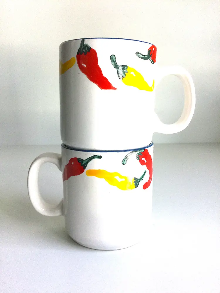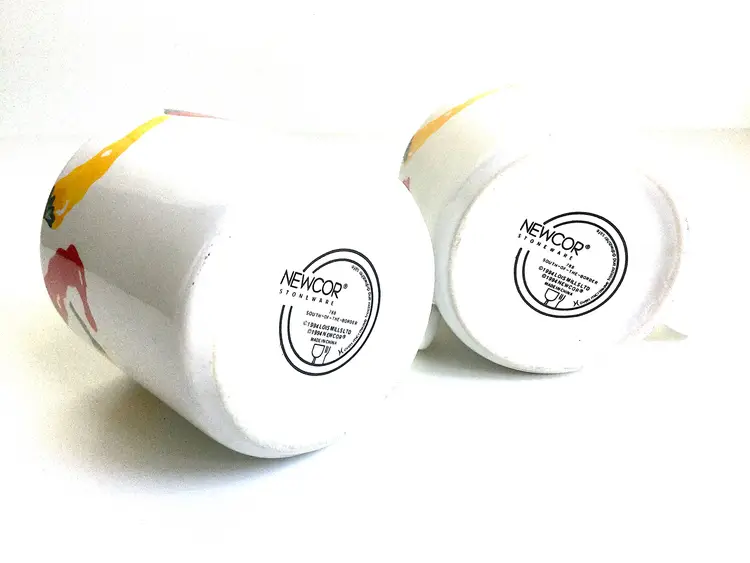 -standard-sized mugs with full-color graphics along top edge -marked 'NEWCOR Stoneware, 788 South-of-the-Border, 1994 Lois Mills Ltd' on bottoms -in very good vintage condition with no chips or cracks