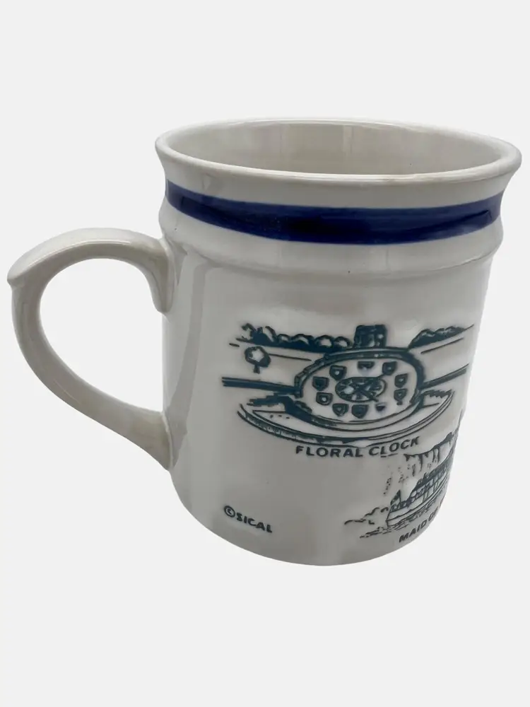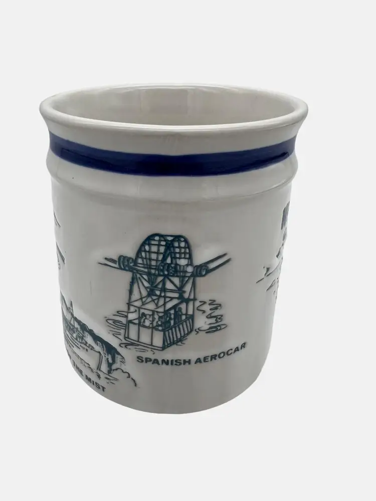 Vintage Niagara Falls Canada ceramic souvenir mug from Sical. The mug features images of various landmarks and attractions around the falls. It is 3.75" tall and is white with blue print and trim.