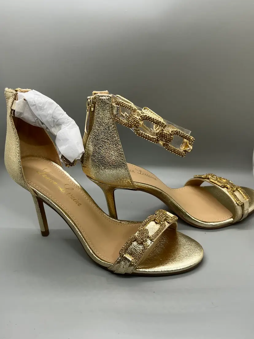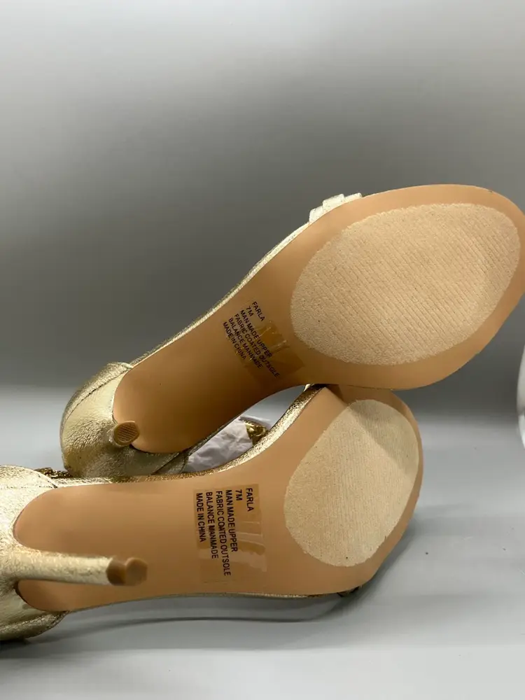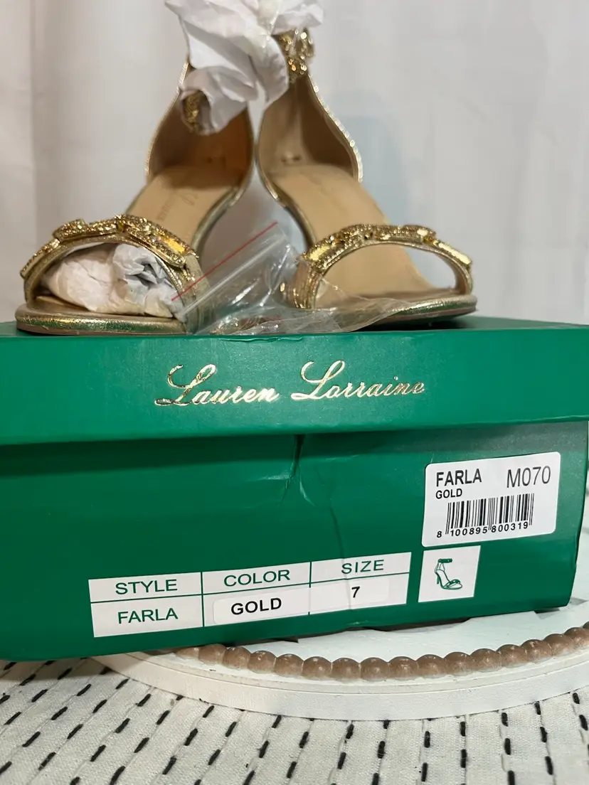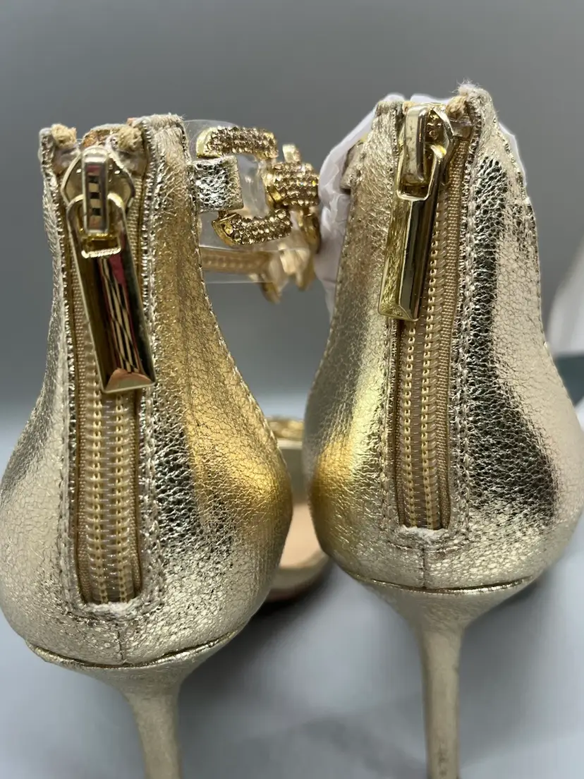 New in Box Size 7 Women’s gold strap heels with zipper for easy on/off. Beautiful bling that makes you really make a statement.