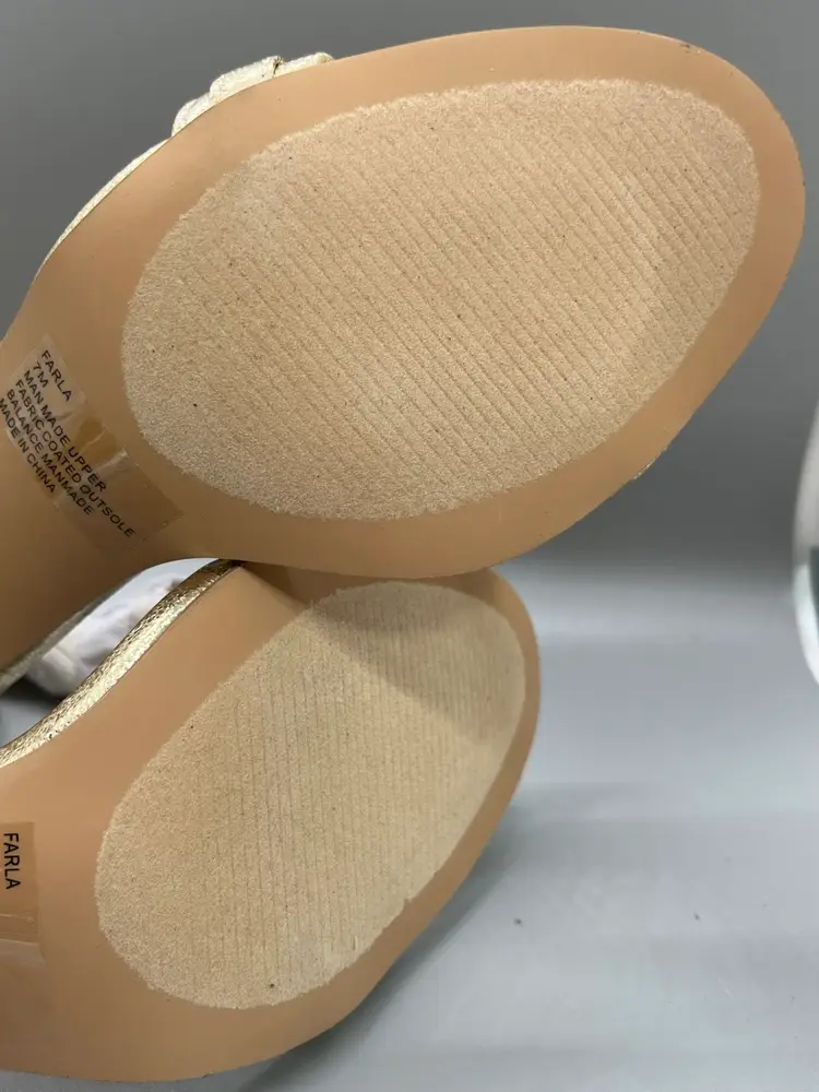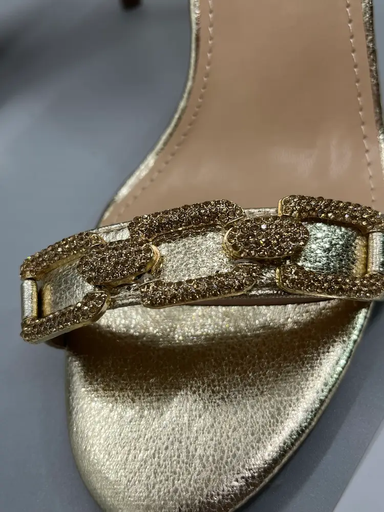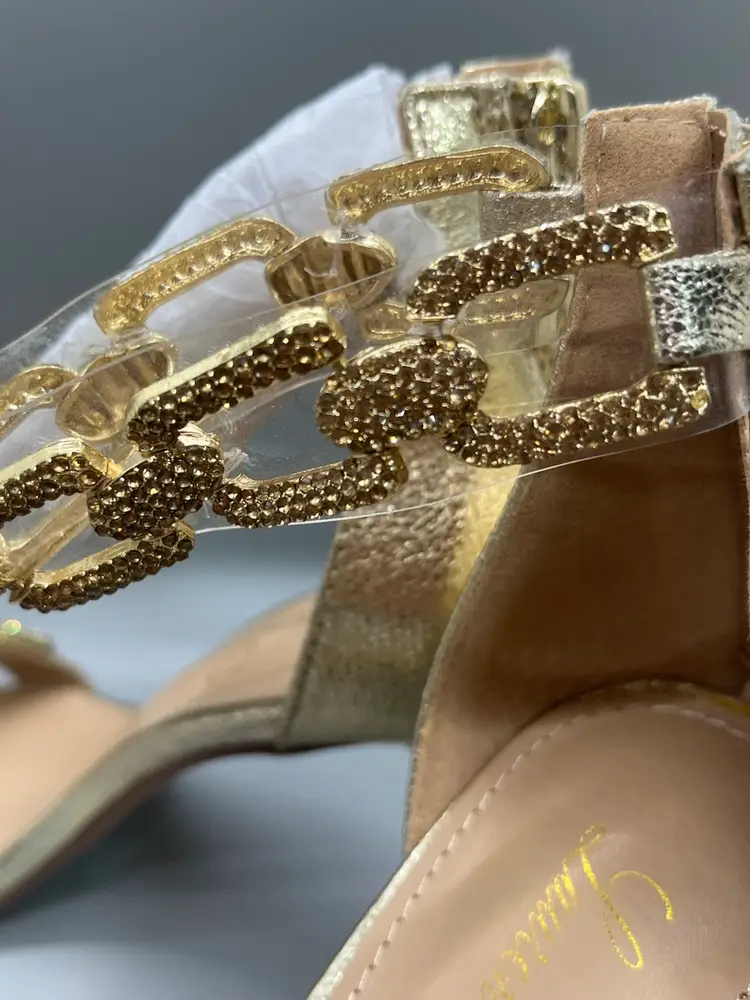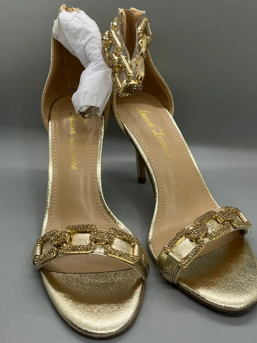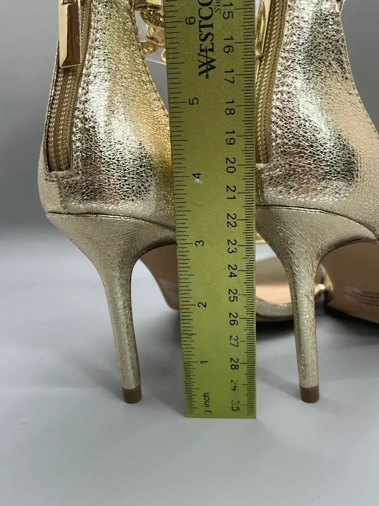 New in Box Size 7 Women’s gold strap heels with zipper for easy on/off. Beautiful bling that makes you really make a statement.