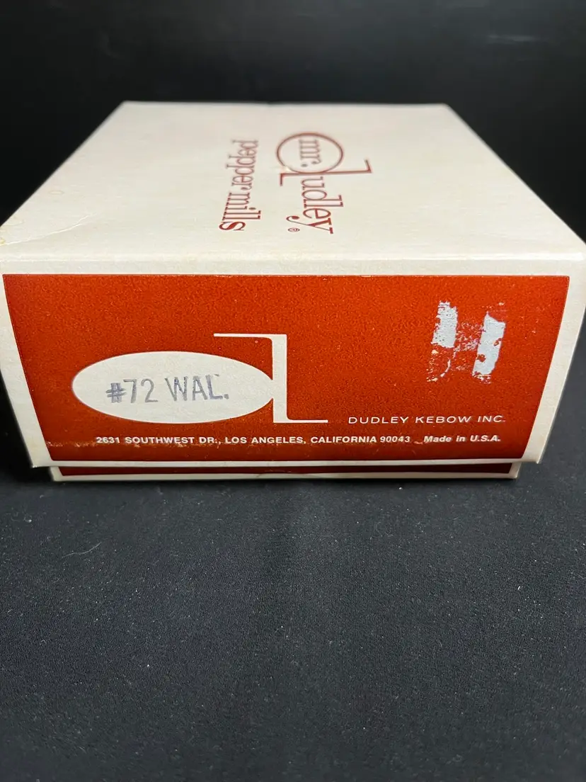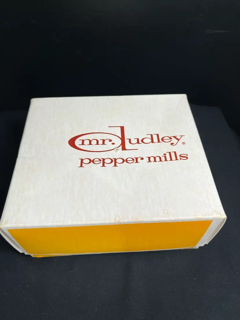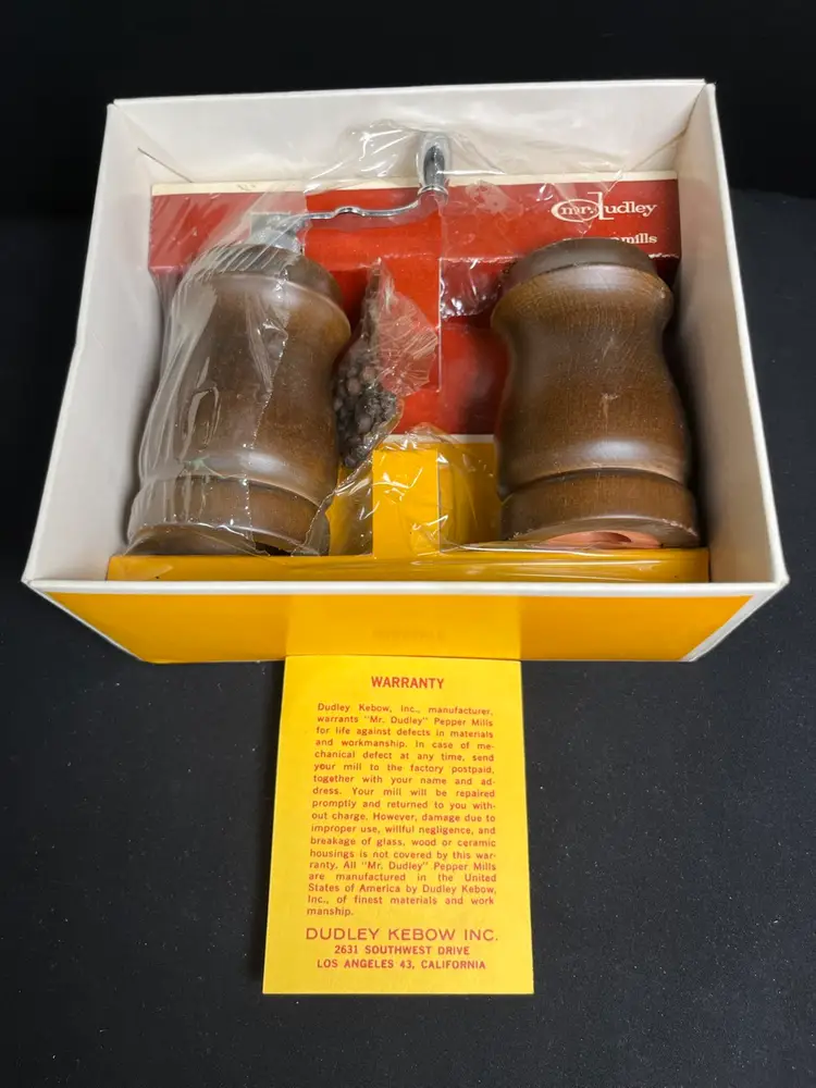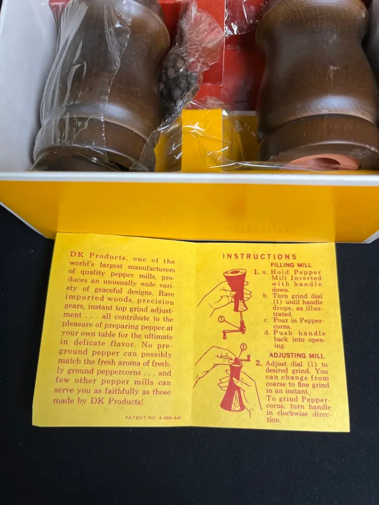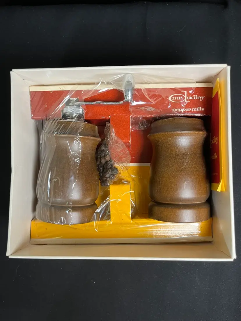 Rubber stopper on salt is hardened related to age. Are in new condition. Box measures 5" x 6", Salt shaker is approx 3"H, 2" W, pepper mill is approx 4.5" H, 2.75" W, 10.7 Oz